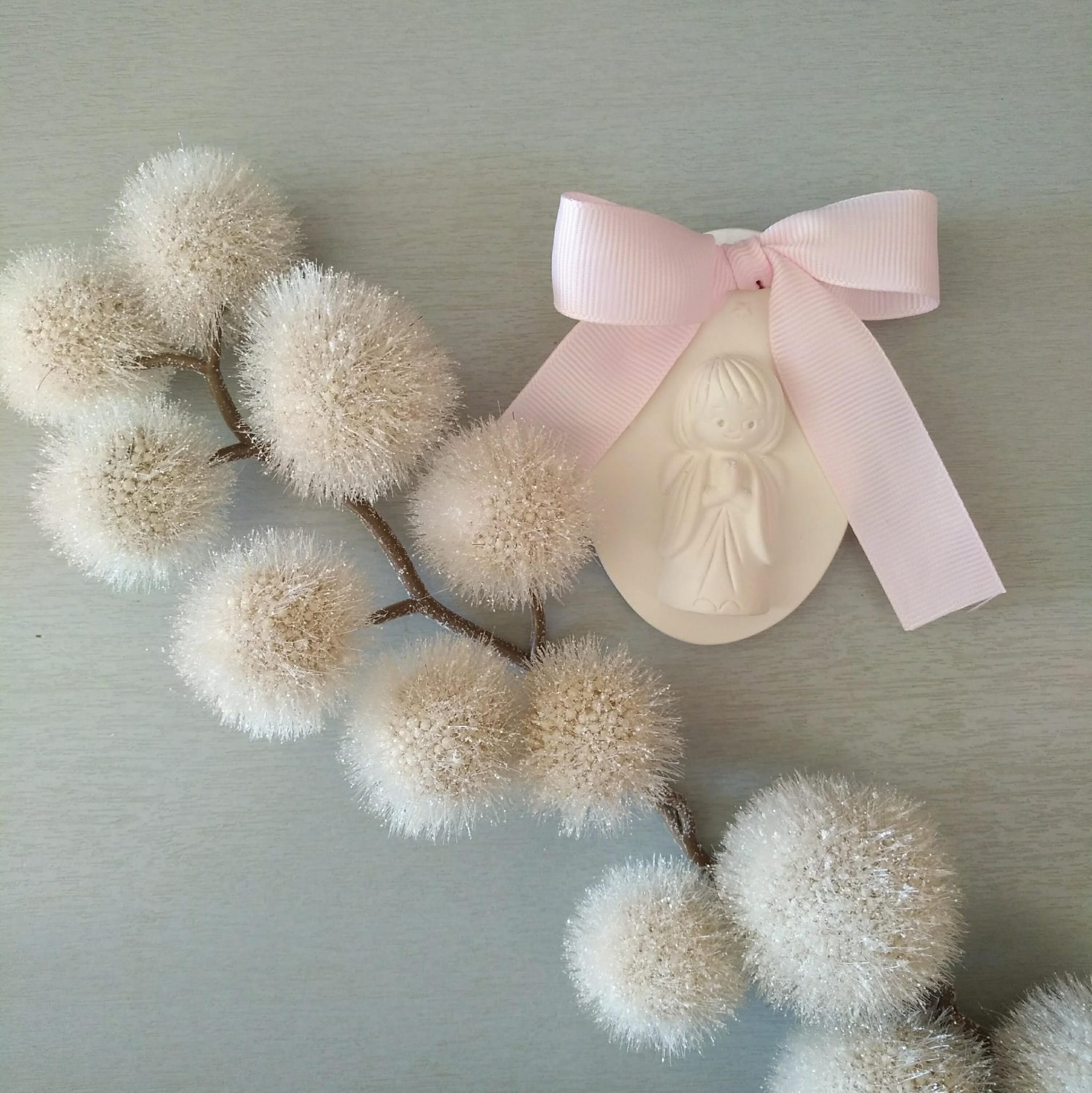 • Raminho com bolas brancas e pendente com anjo e laço rosa