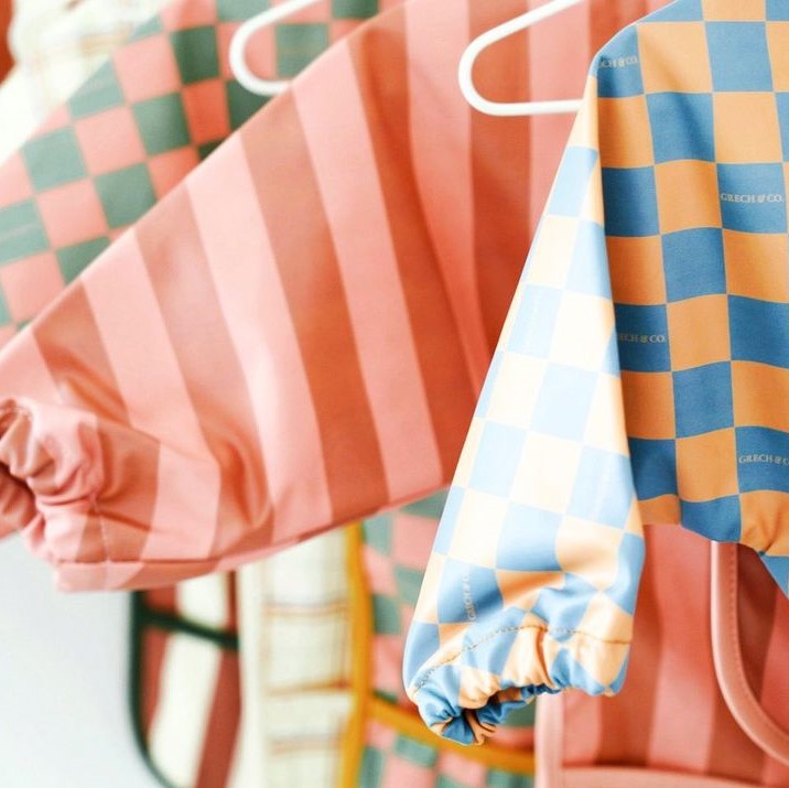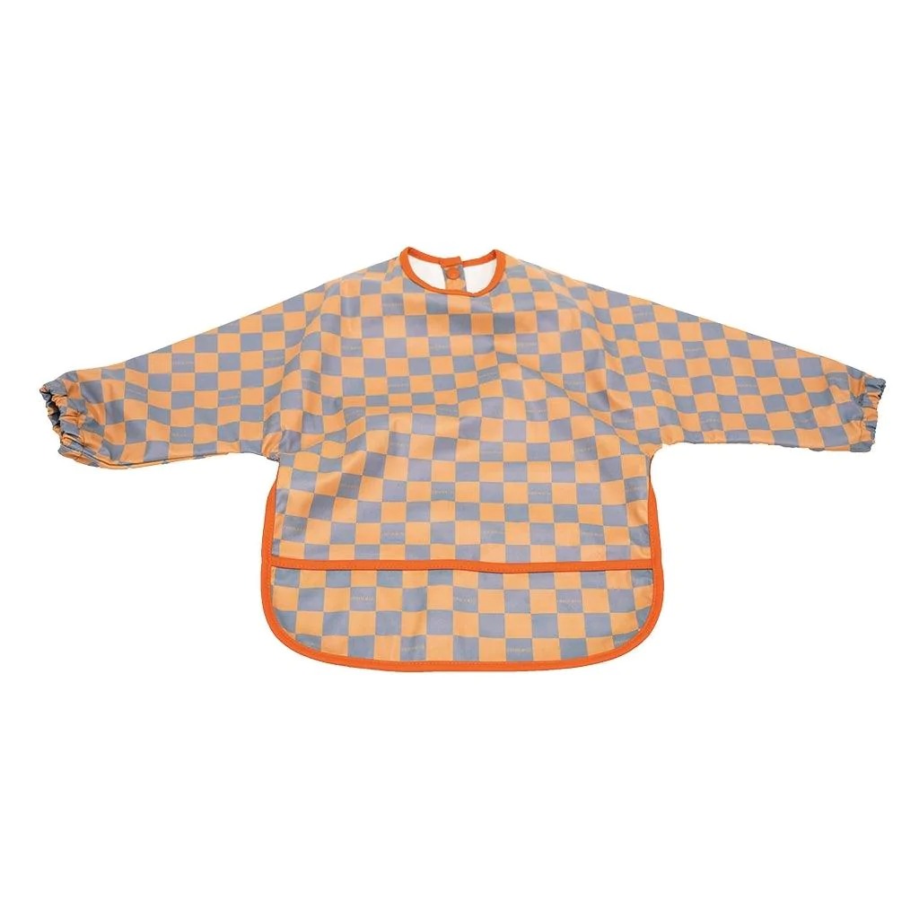 • Babete de manga comprida cinzento e laranja com padrão de quadrados