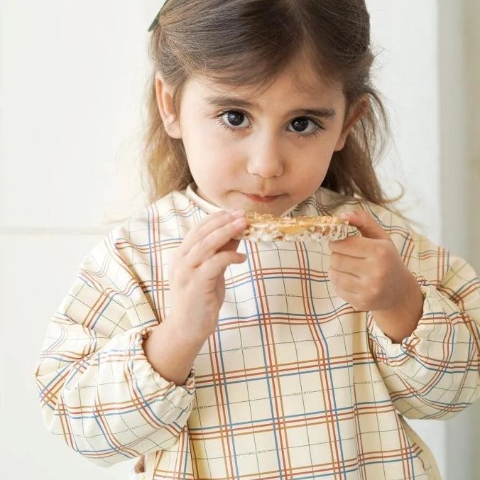 • Babete impermeável de mangas compridas com padrão xadrez em tons de bege e castanho.