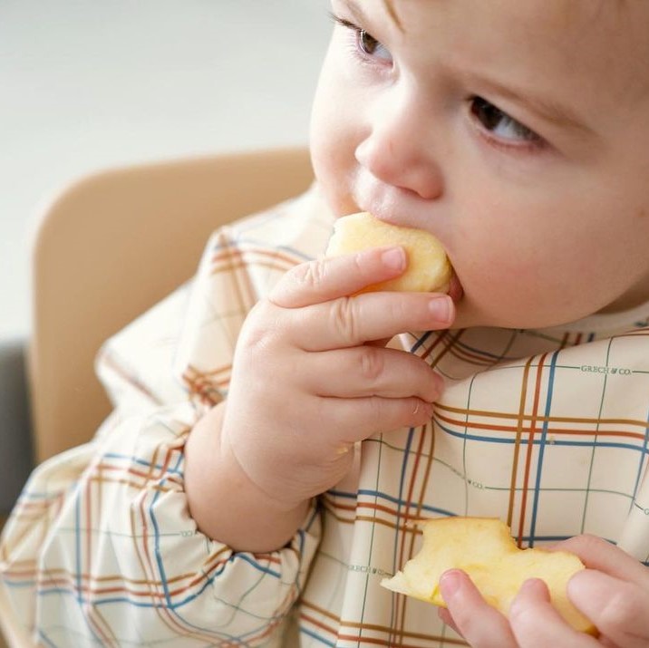 • Criança a morder brinquedo de silicone alaranjado com padrão de sol, vestindo babete xadrez azul e castanho