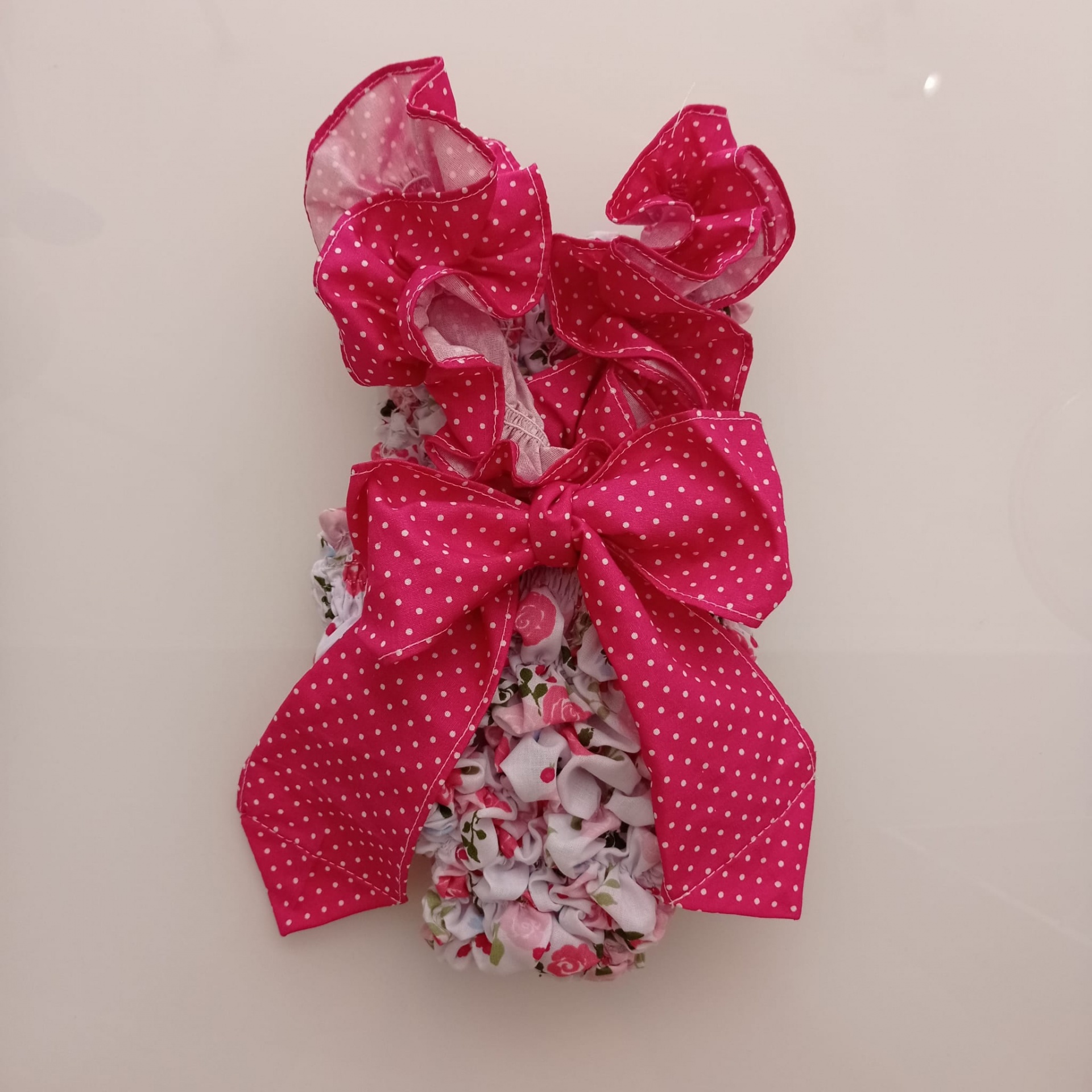 • Coelho de pelúcia com padrão floral e laços rosa com bolinhas brancas