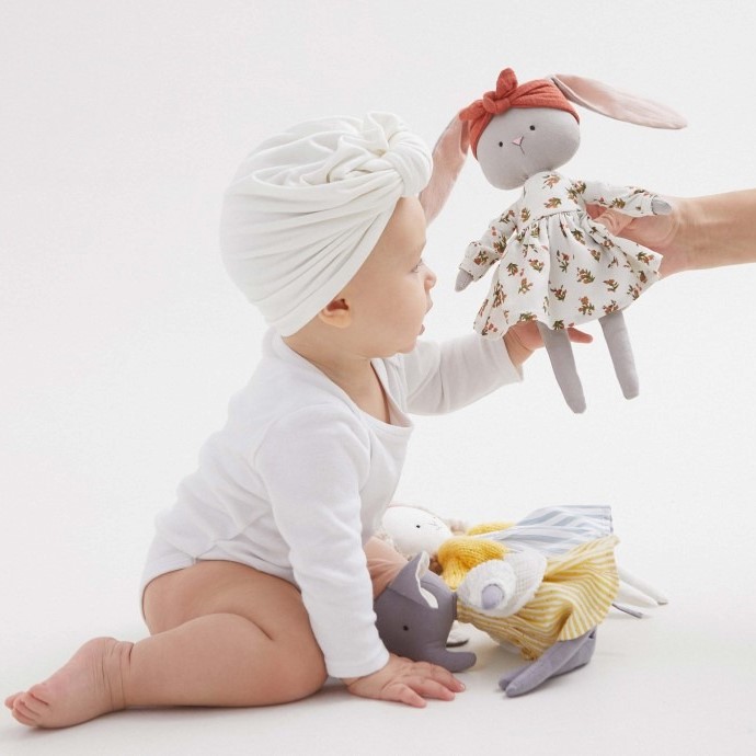 • Bebé com body branco e turbante branco brinca com bonecas de tecido coloridas
