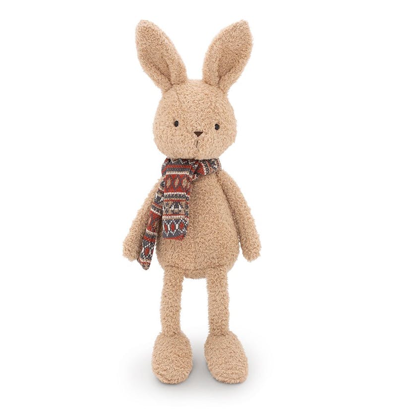 • Pelúcia de coelho cinzento com cachecol e gorro cor de salmão