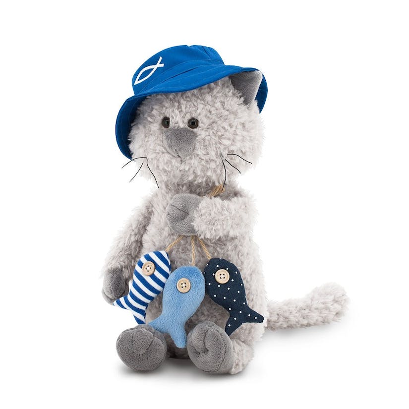 • Pelúcia de gato cinzento com chapéu azul e peixes de tecido pendurados no peito