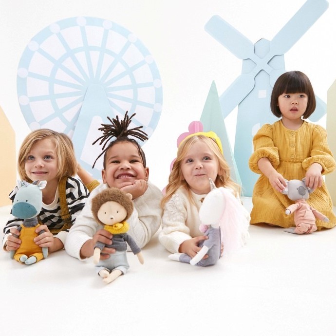 • Quatro crianças com bonecos de pelúcia sentadas em fundo branco com roda gigante e moinho de vento ao fundo