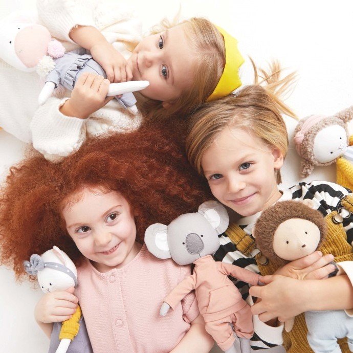 • Crianças com bonecos de pelúcia macios de várias cores e roupas diferentes