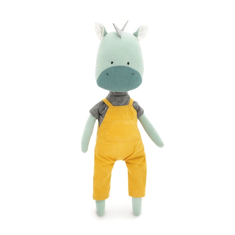 • Boneco de peluche unicórnio com jardineiras amarelas