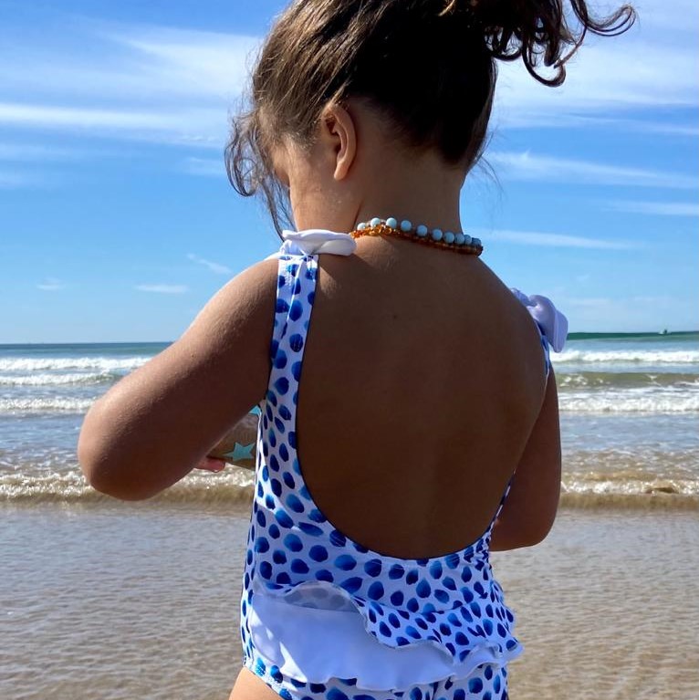 • Fato de banho infantil azul com bolinhas brancas na praia