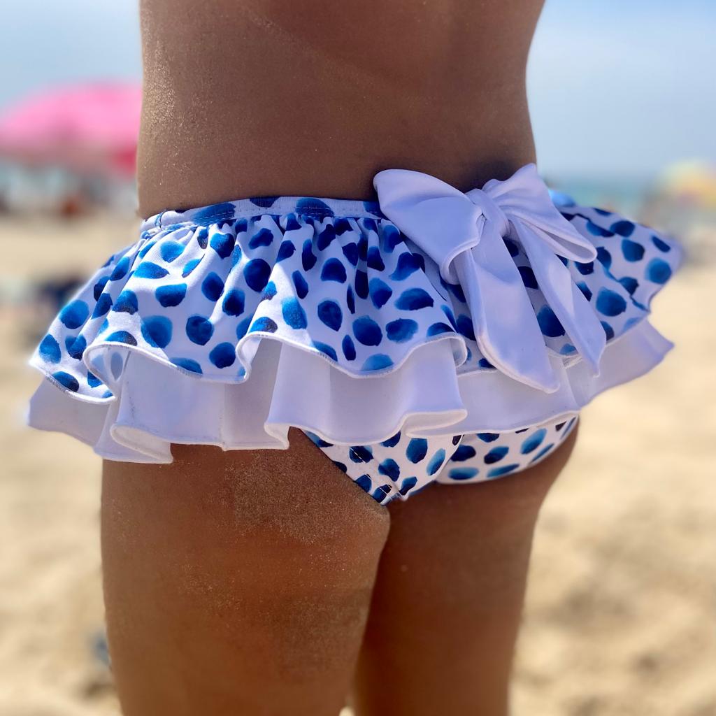 • Cueca de banho infantil azul com babados e laço branco na praia