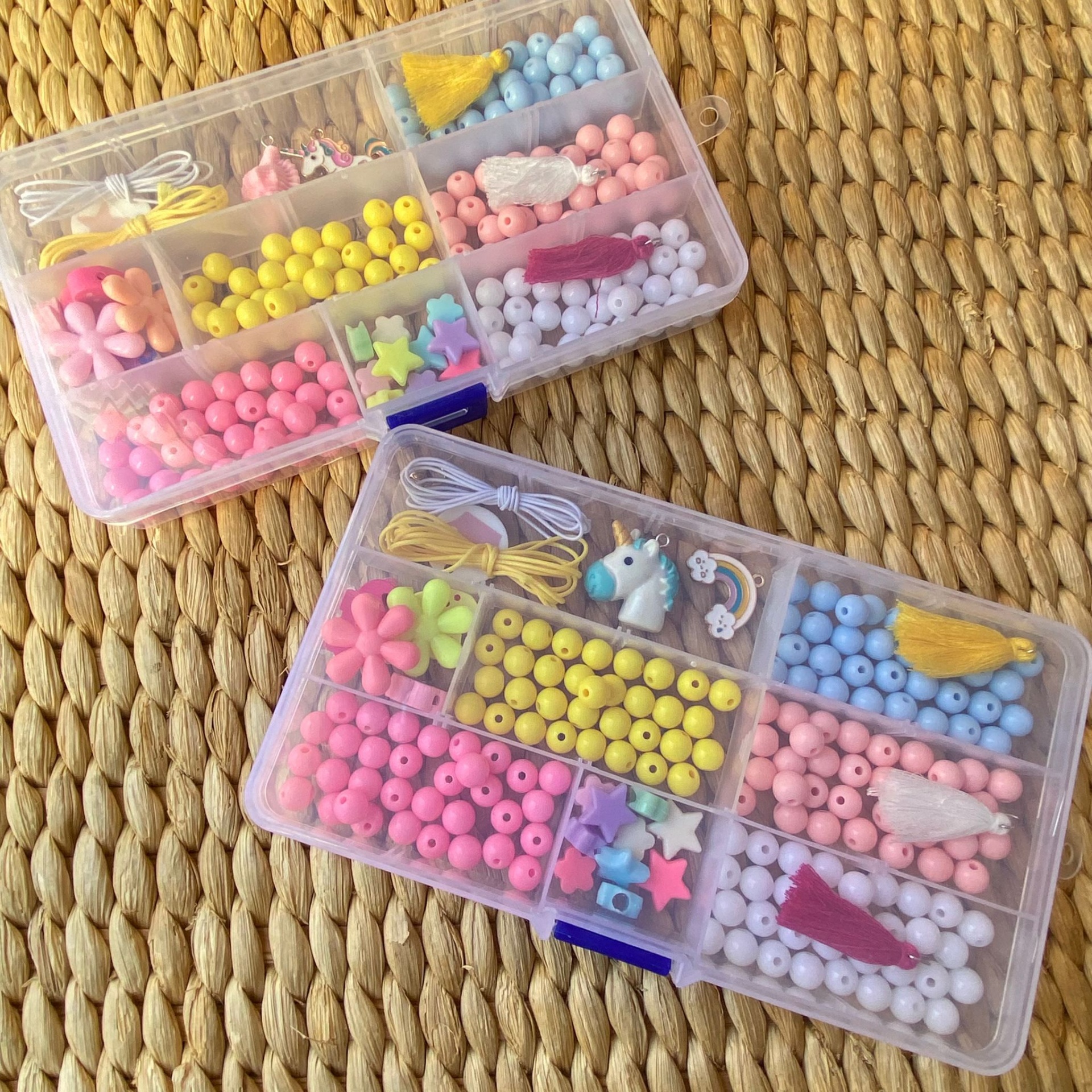 • Caixas transparentes com miçangas coloridas e acessórios em cima de superfície de fibras naturais entrelaçadas.
