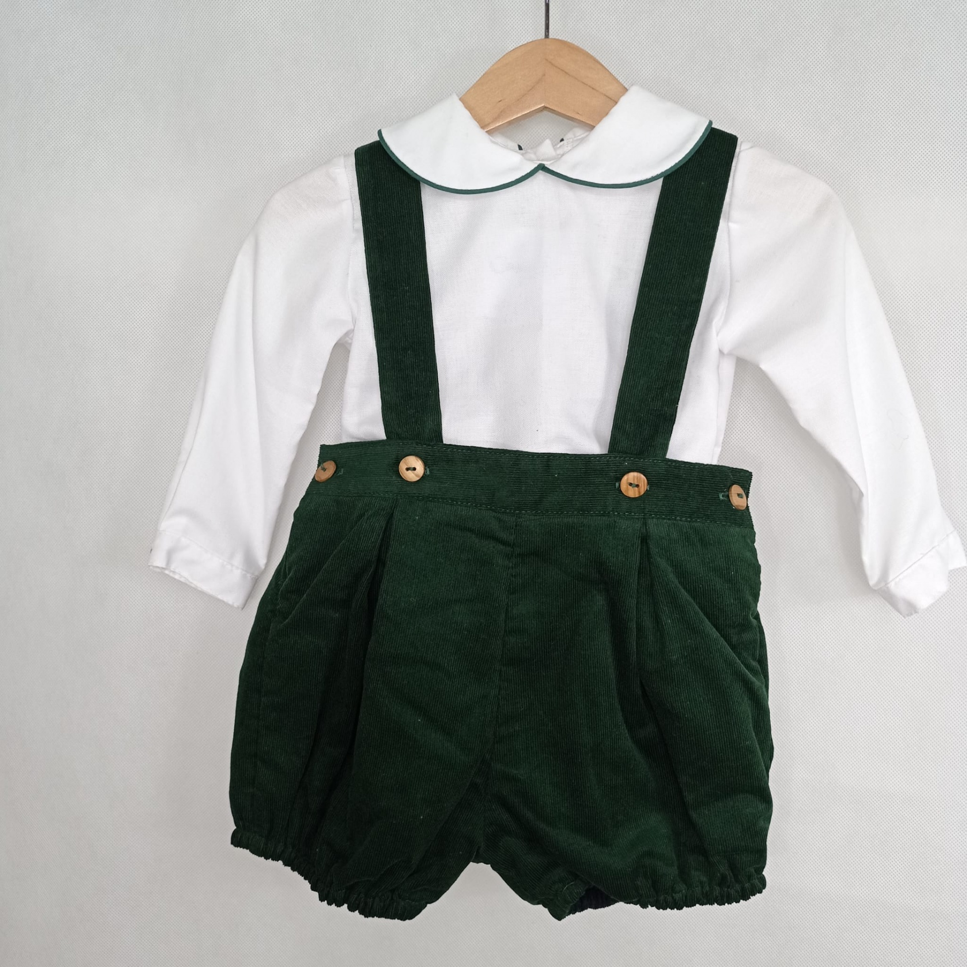 • Conjunto infantil branco e verde com camisa de gola e calções de veludo