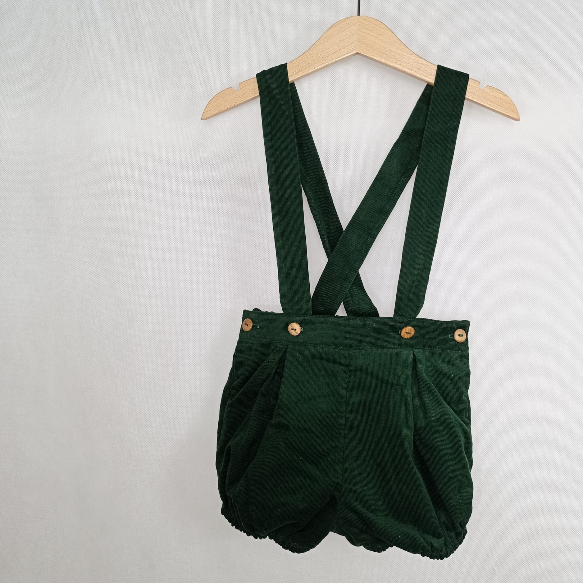 • Calção de bebé verde em veludo com alças cruzadas e botões