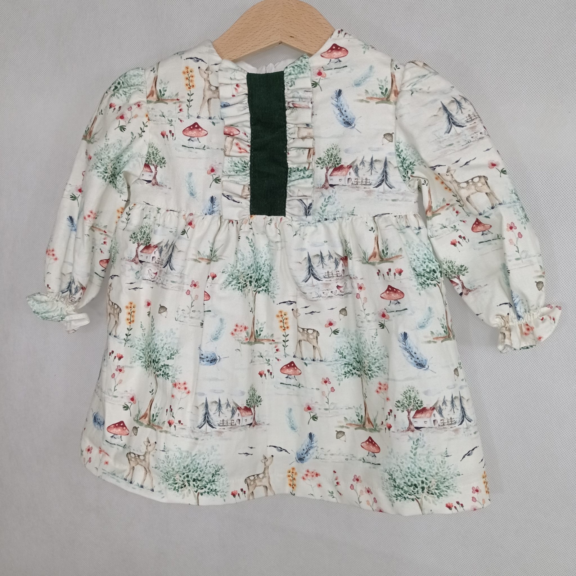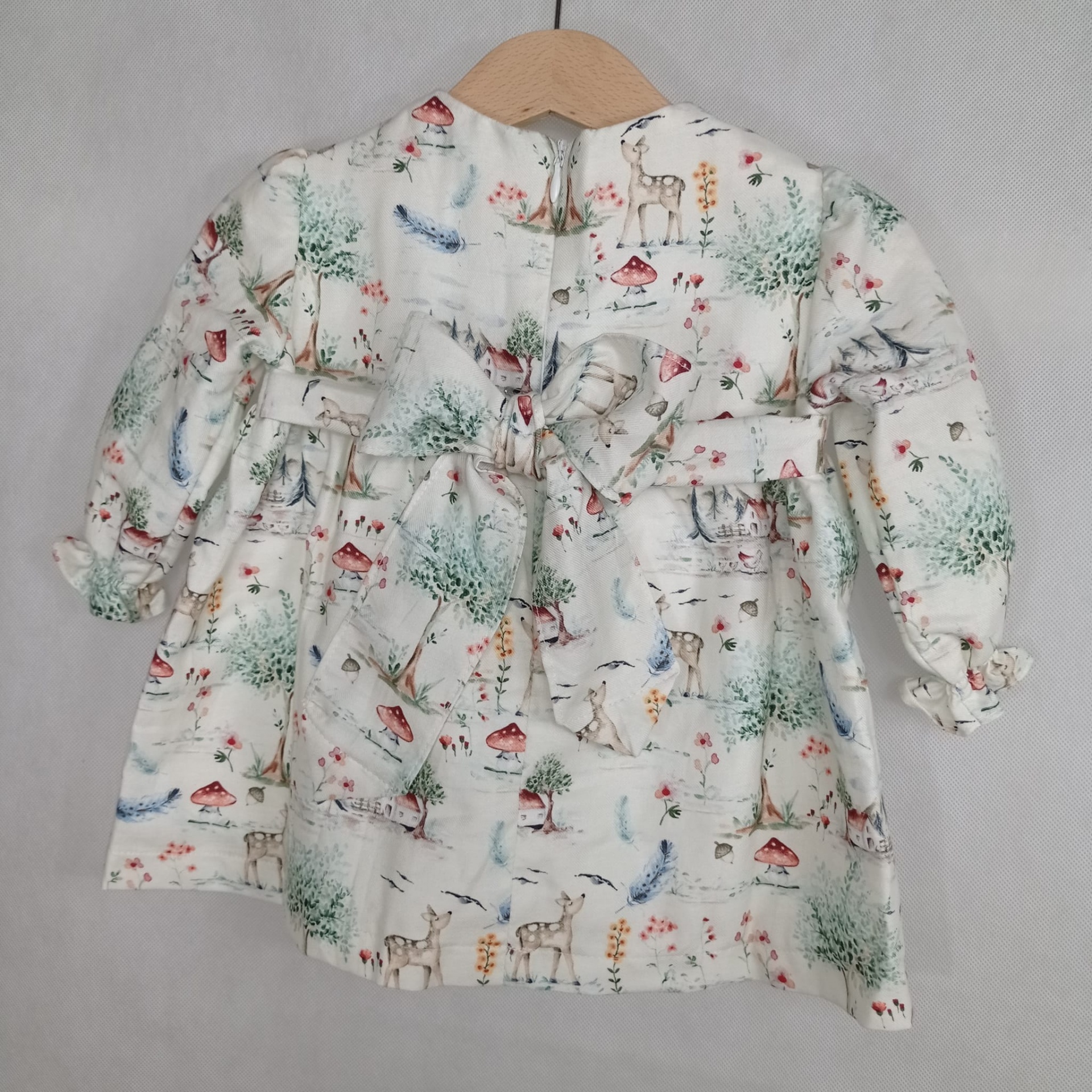• Vestido infantil branco com padrão de veados, cogumelos, árvores e pássaros