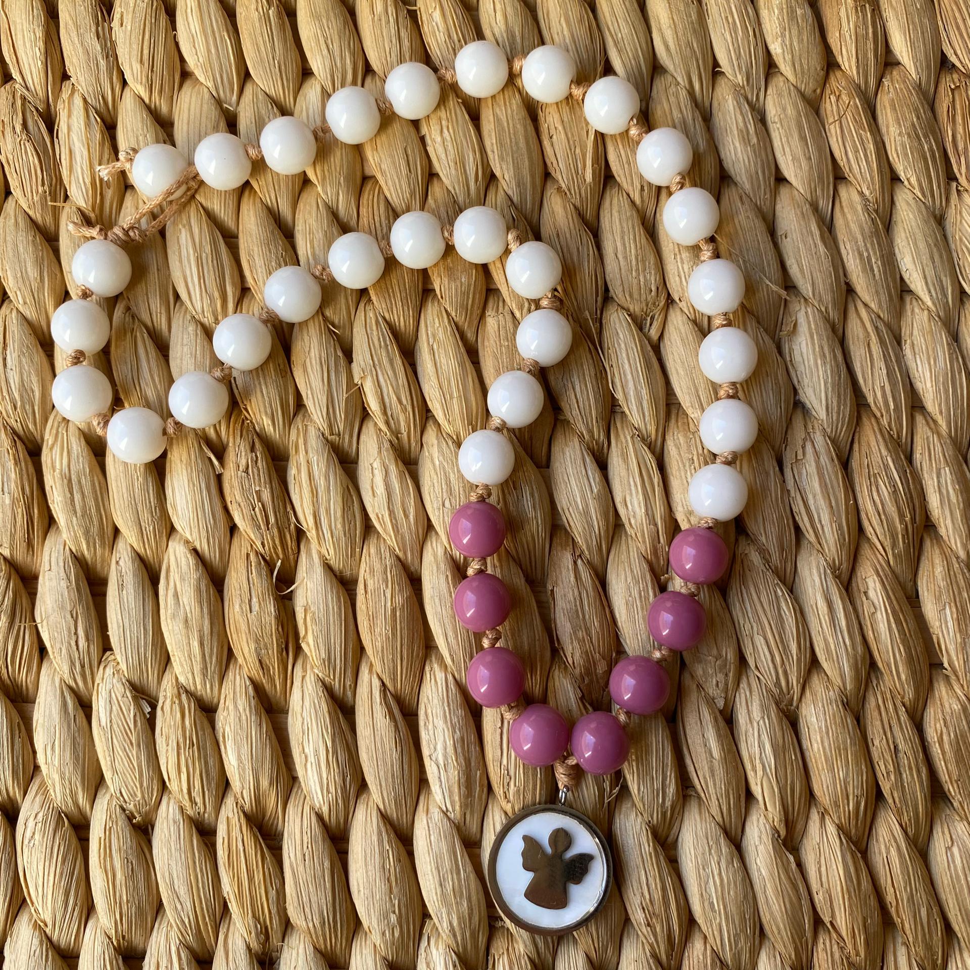 • Colar com contas brancas e rosas com pendente de anjo sobre superfície de ráfia