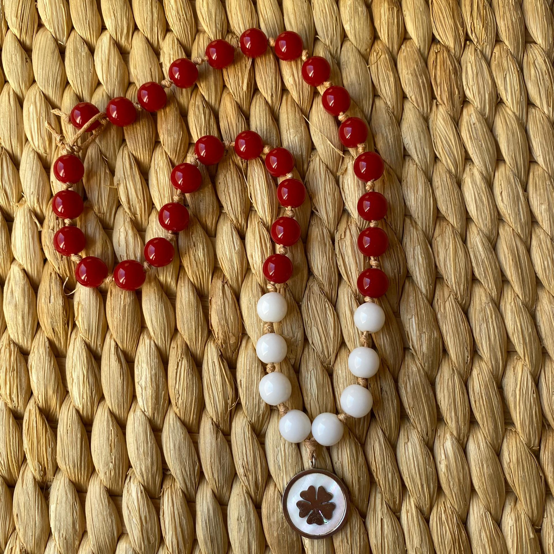 Colar com contas vermelhas e brancas e pendente de trevo sobre tecido trançado bege