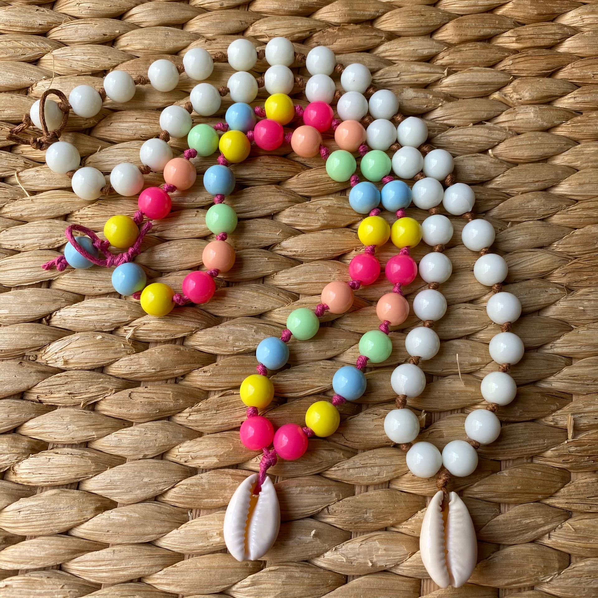 • Colares com contas coloridas e brancas com pendentes de conchas em superfície de palha