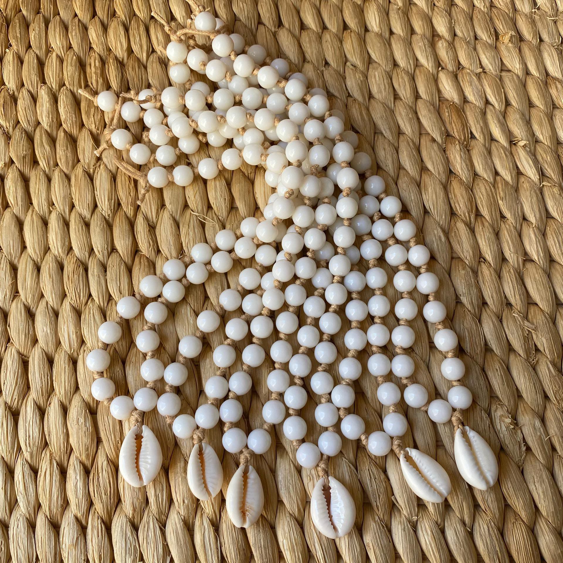 Colar com contas brancas e conchas sobre tecido trançado bege