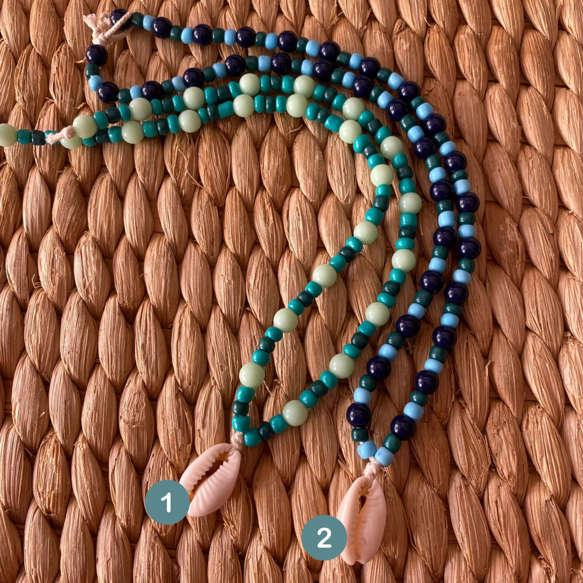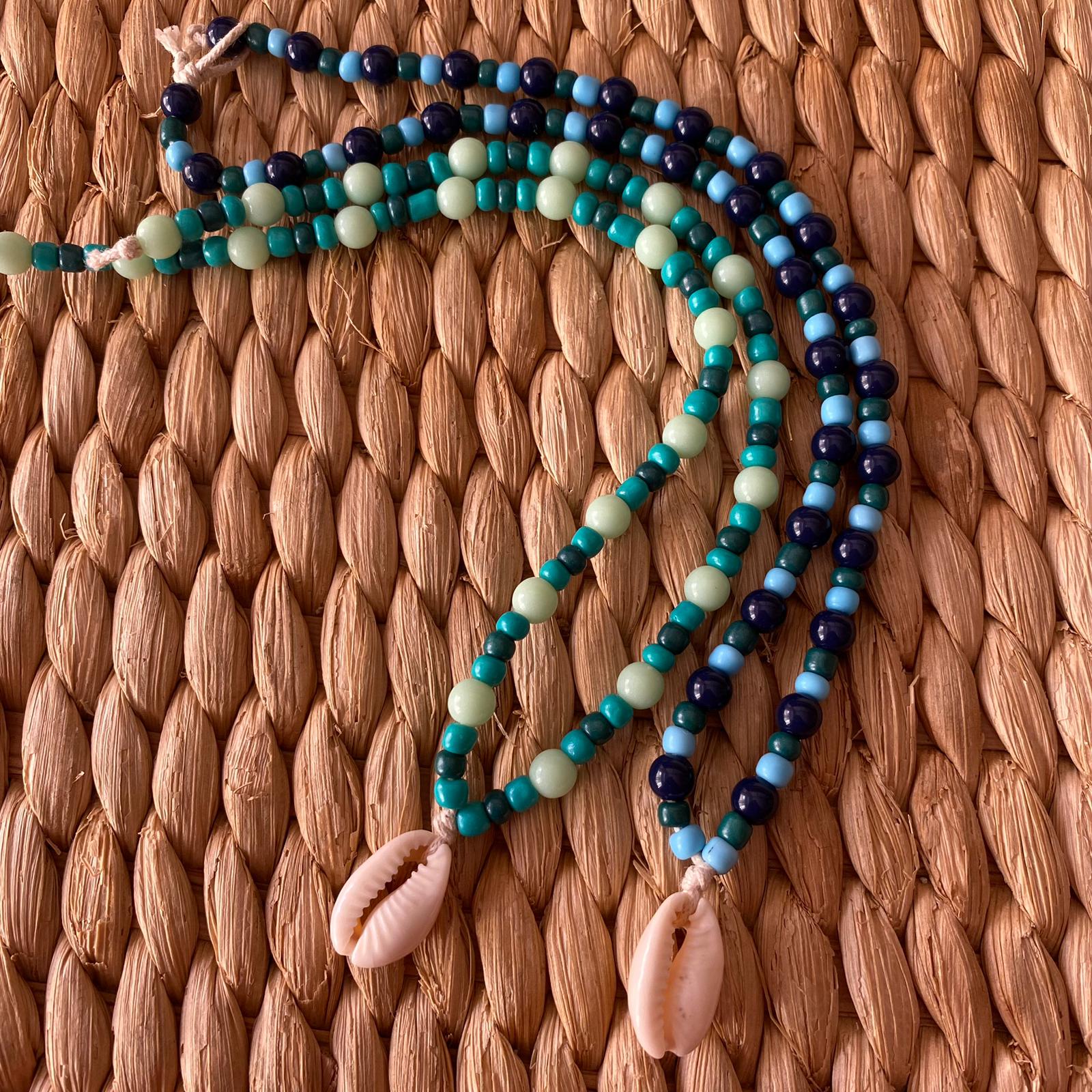 Três colares boémios de contas coloridas com pendentes de conchas em fundo texturizado castanho.