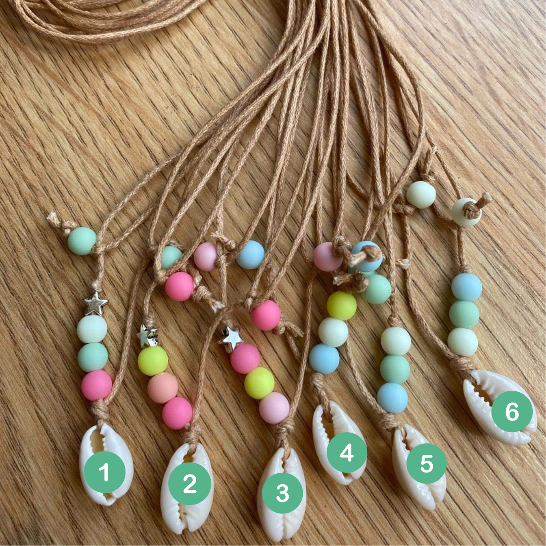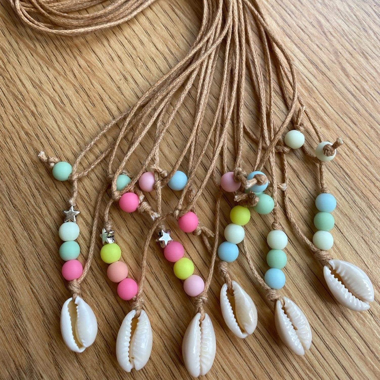 • Colares com contas coloridas e pingentes de concha sobre madeira