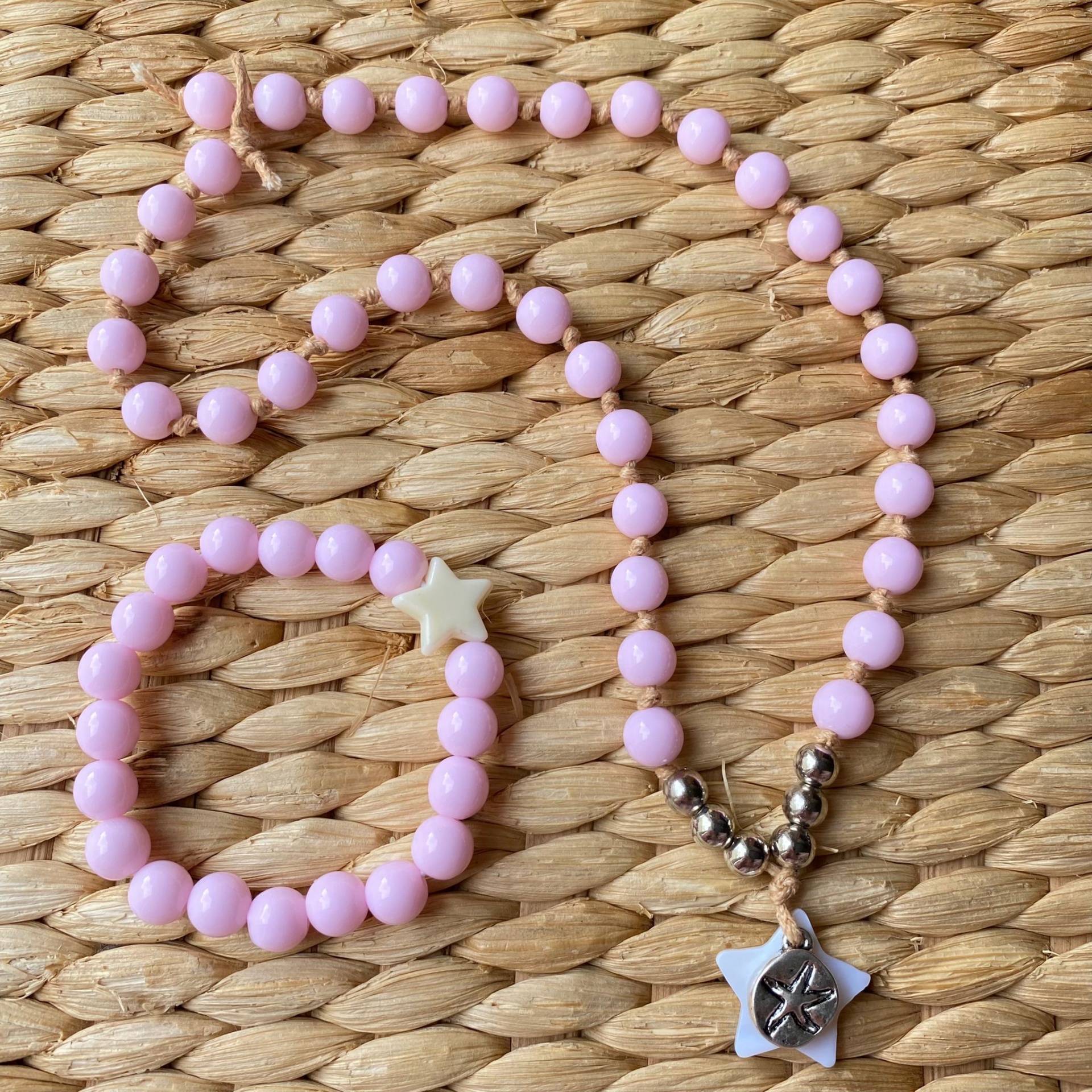 • Conjunto de colar e pulseira com contas rosas e estrela prateada sobre superfície trançada