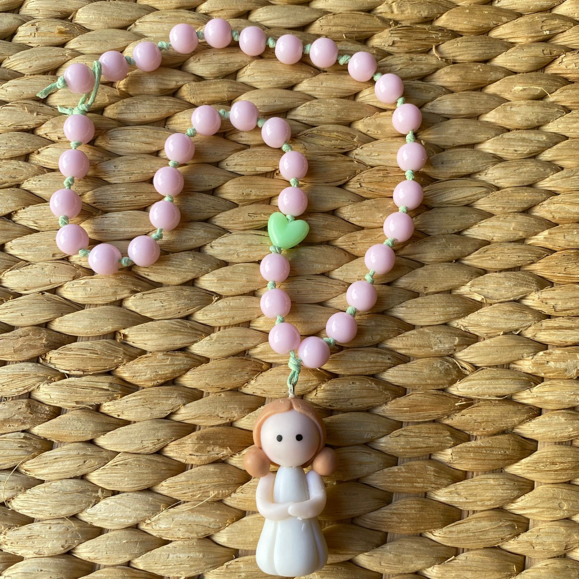 Colar de contas rosadas com pendente de menina