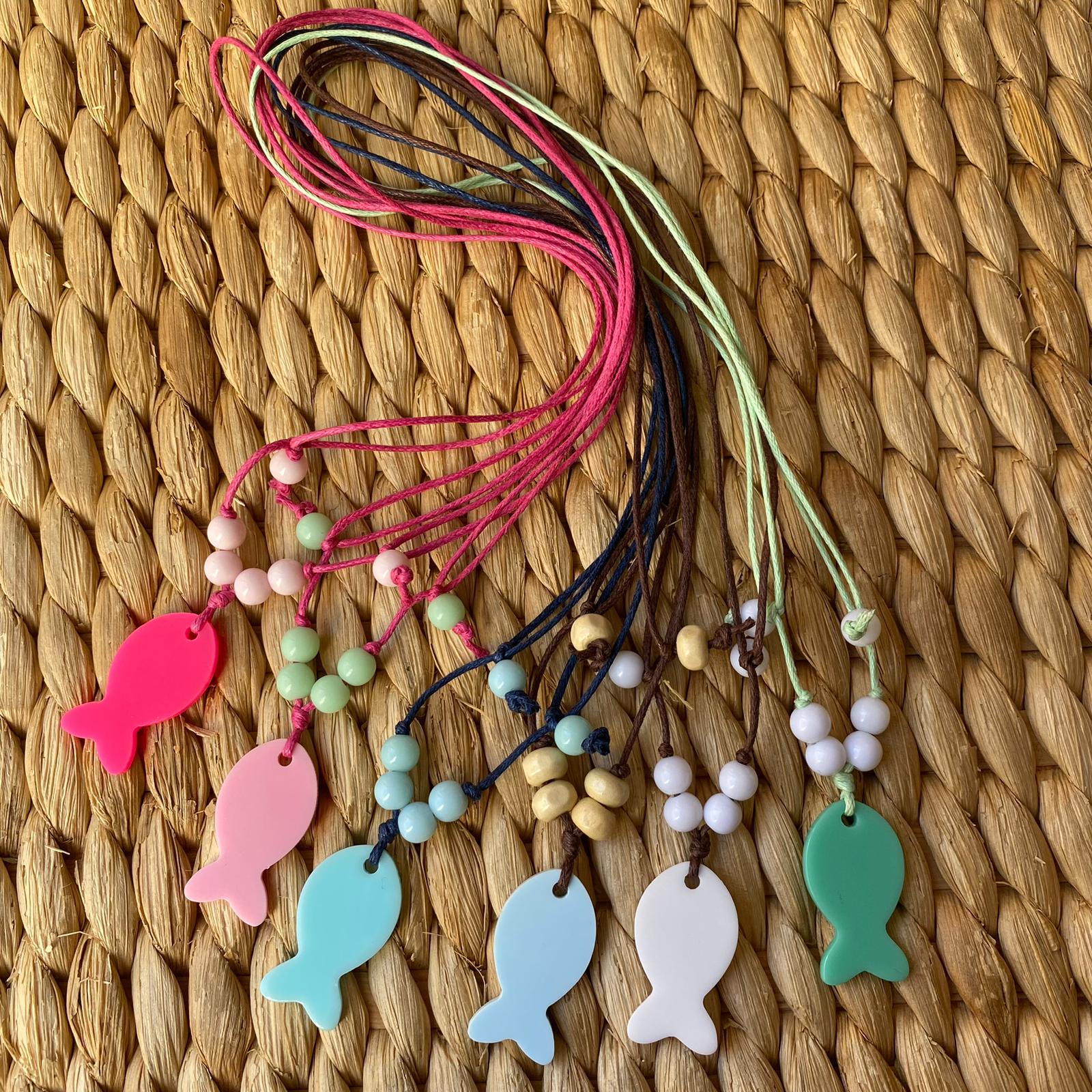 Colares com pendentes de peixe coloridos e contas em fundo trançado