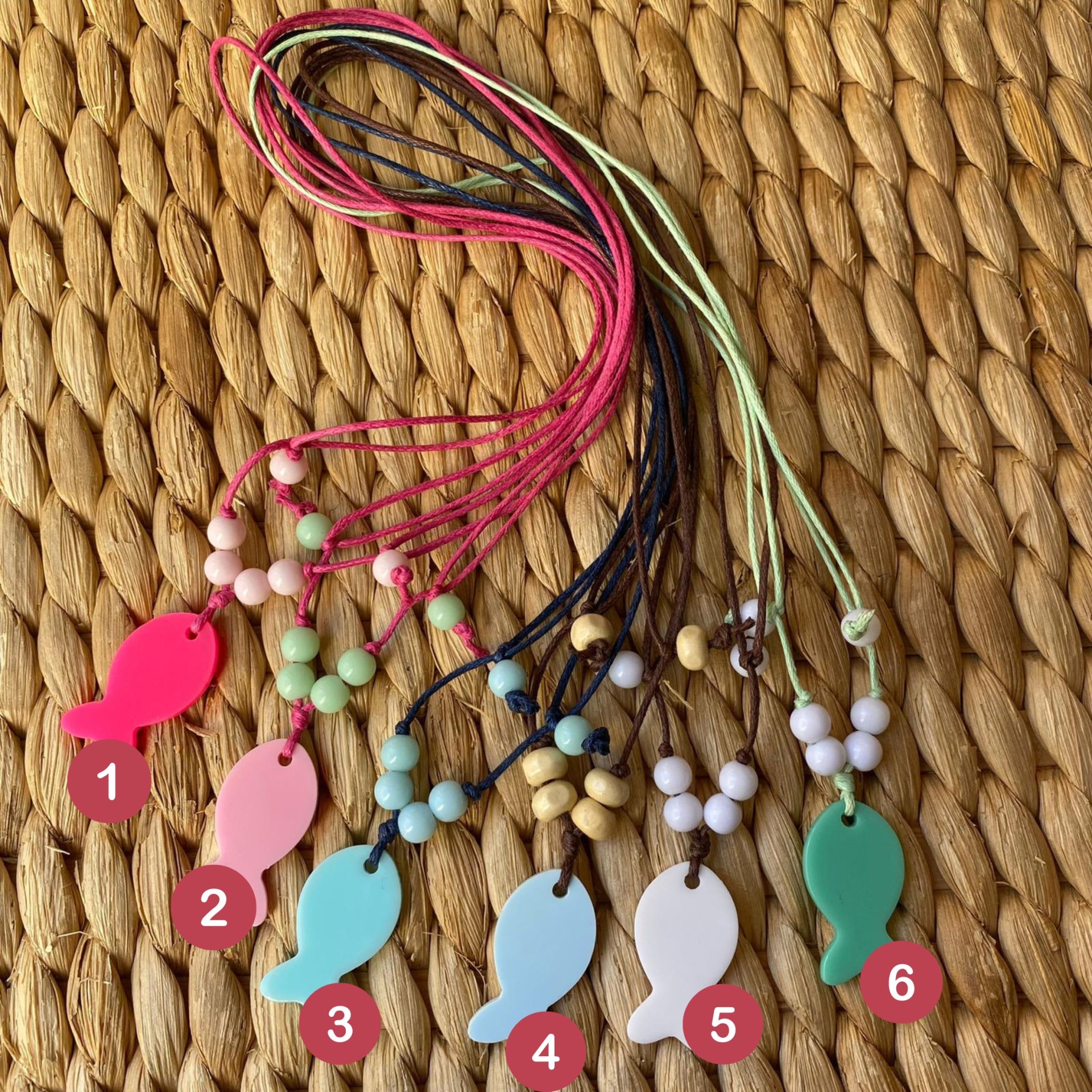 • Seis colares coloridos com pendentes de peixe sobre superfície trançada