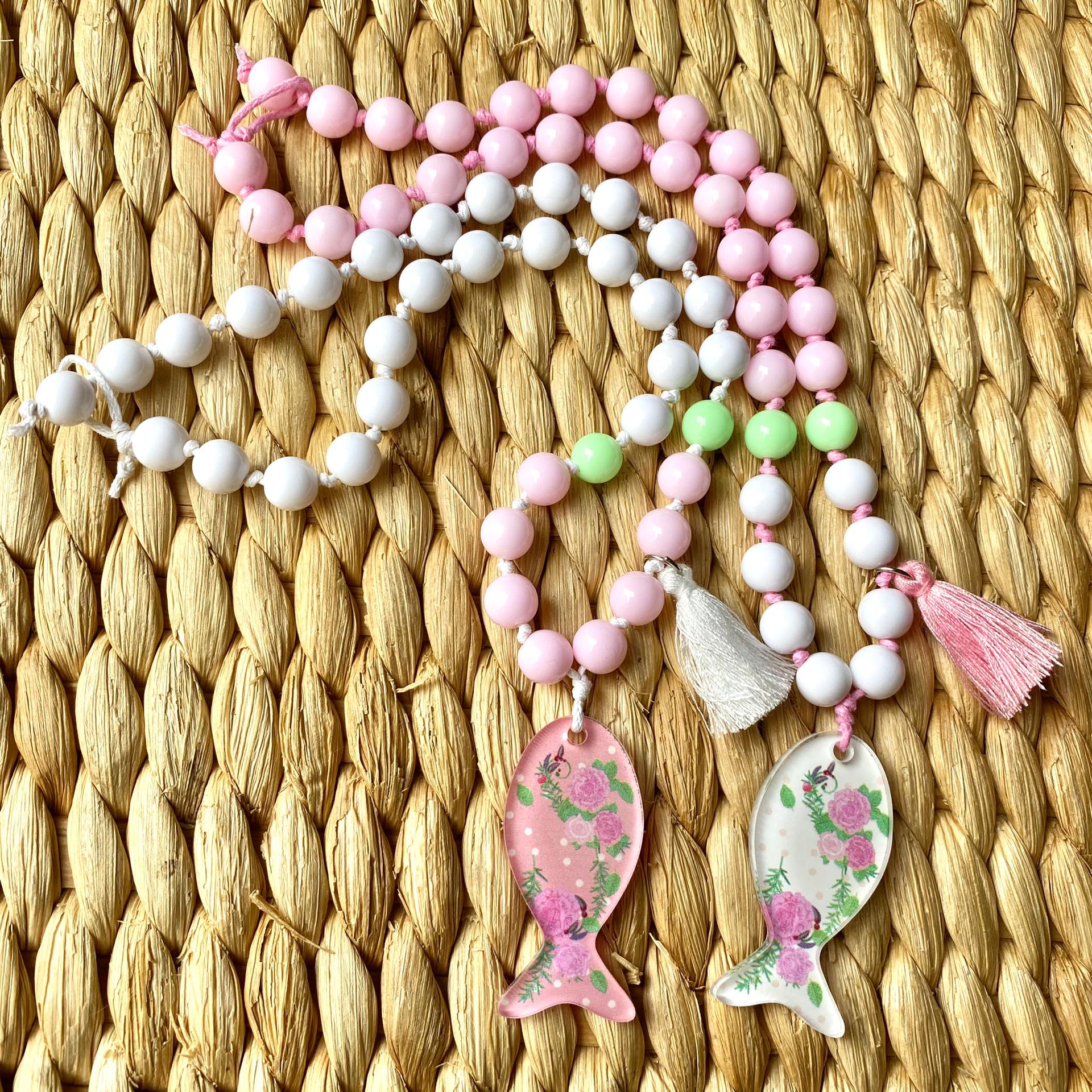 Colares coloridos com pingentes em forma de peixe e contas redondas sobre fundo de juta