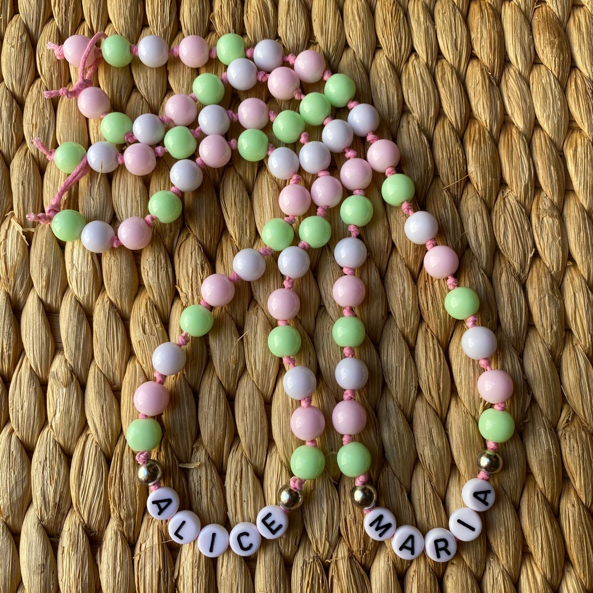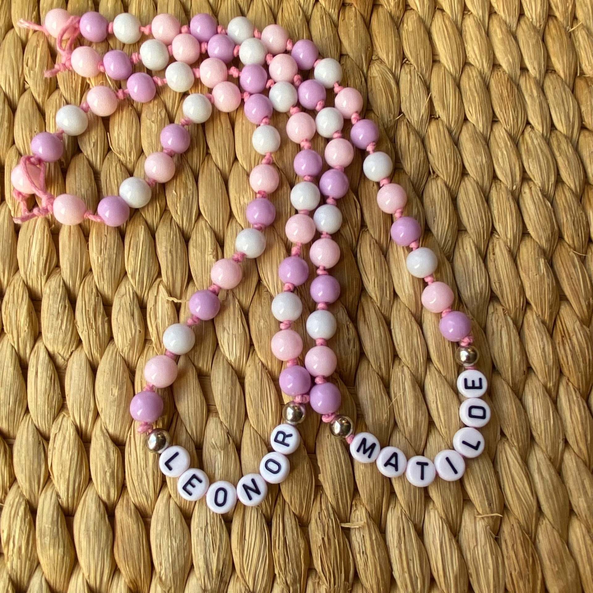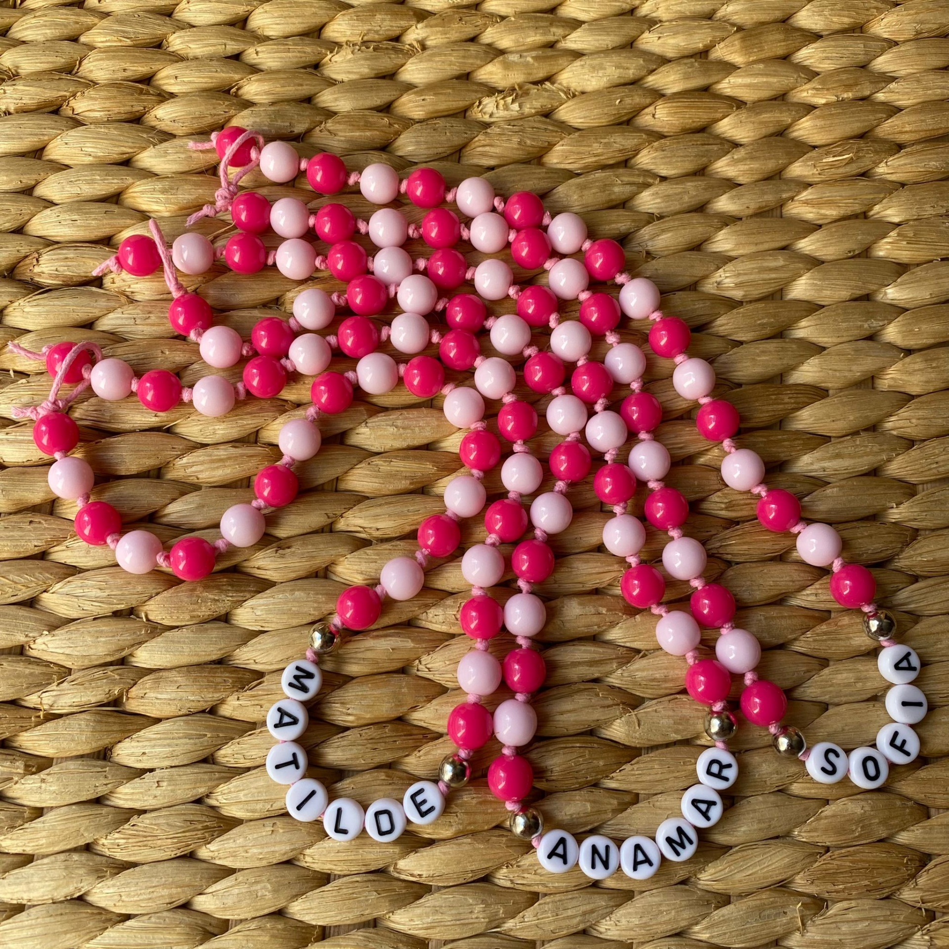 • Colares de contas rosa e fúcsia com nomes em contas brancas sobre tecido trançado