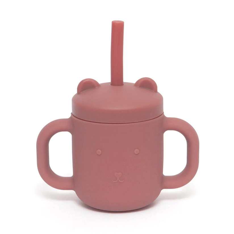 • Copo infantil rosa com canudo e duas pegas, com design de orelhas e rosto simples em relevo