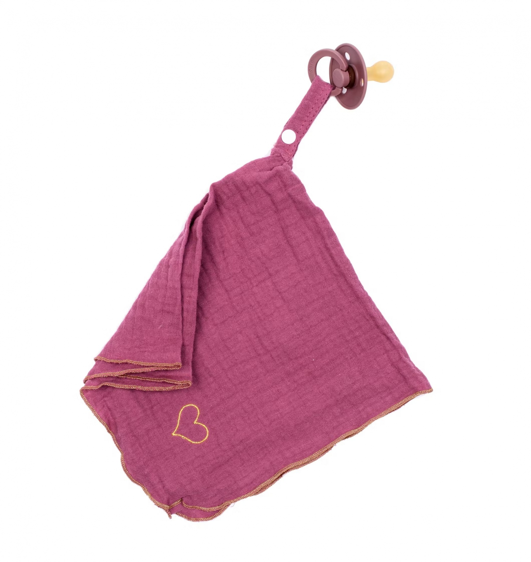 • Manta vinho com borda e coração bordado, presa a chupeta vinho com bico amarelo.
