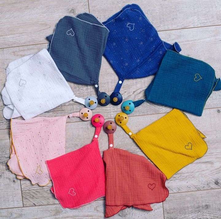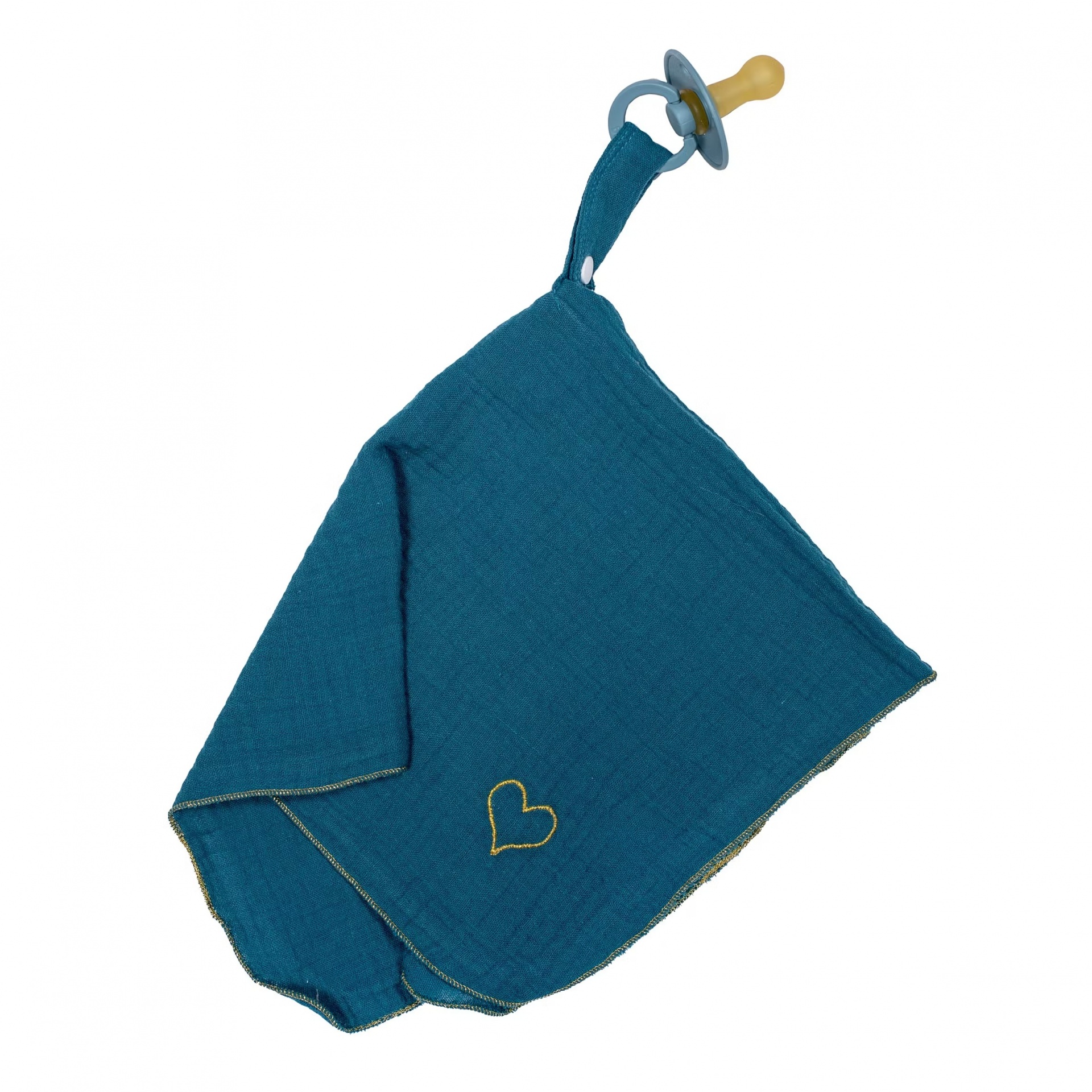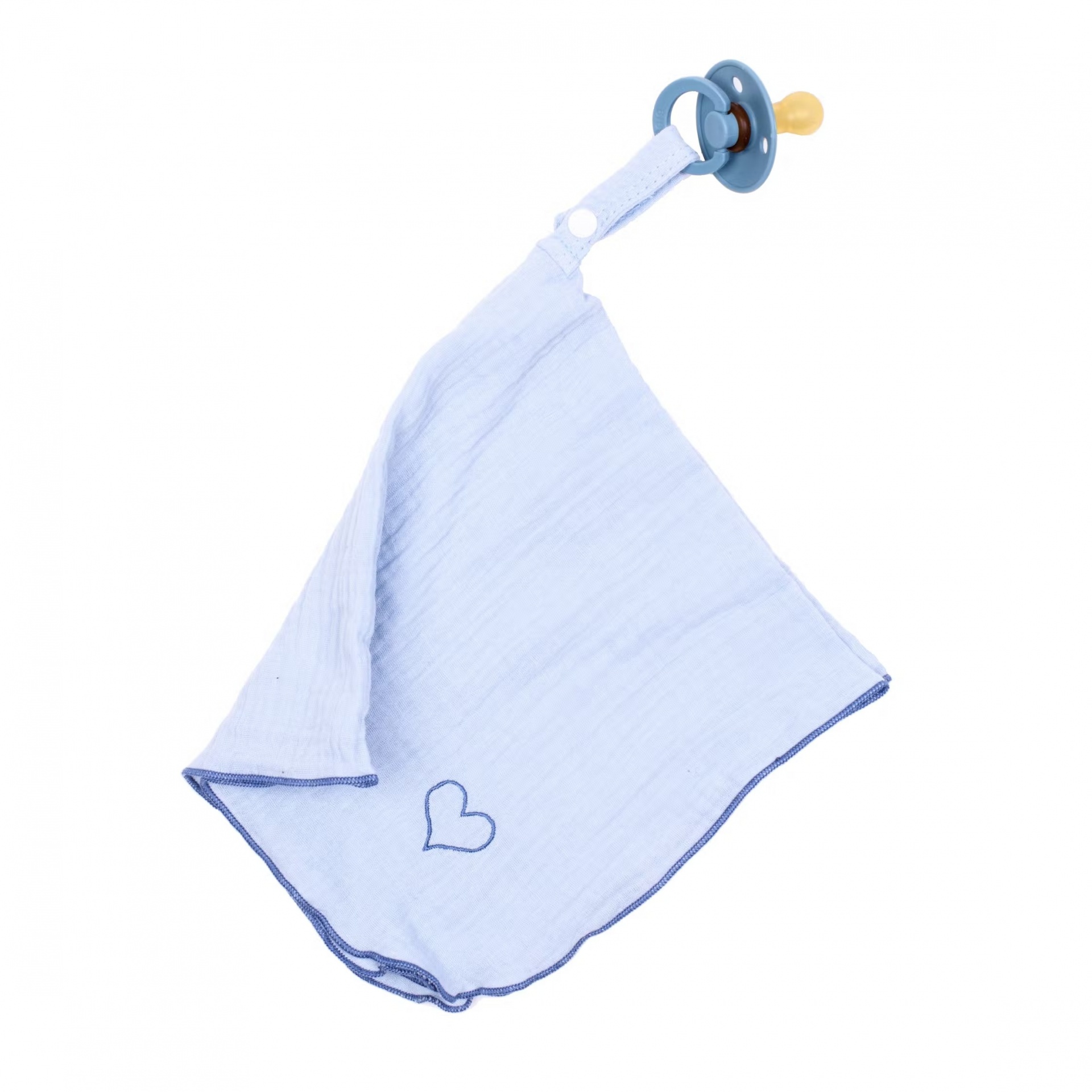 • Chupeta azul com pano de tecido leve azul claro com borda azul escura e coração bordado