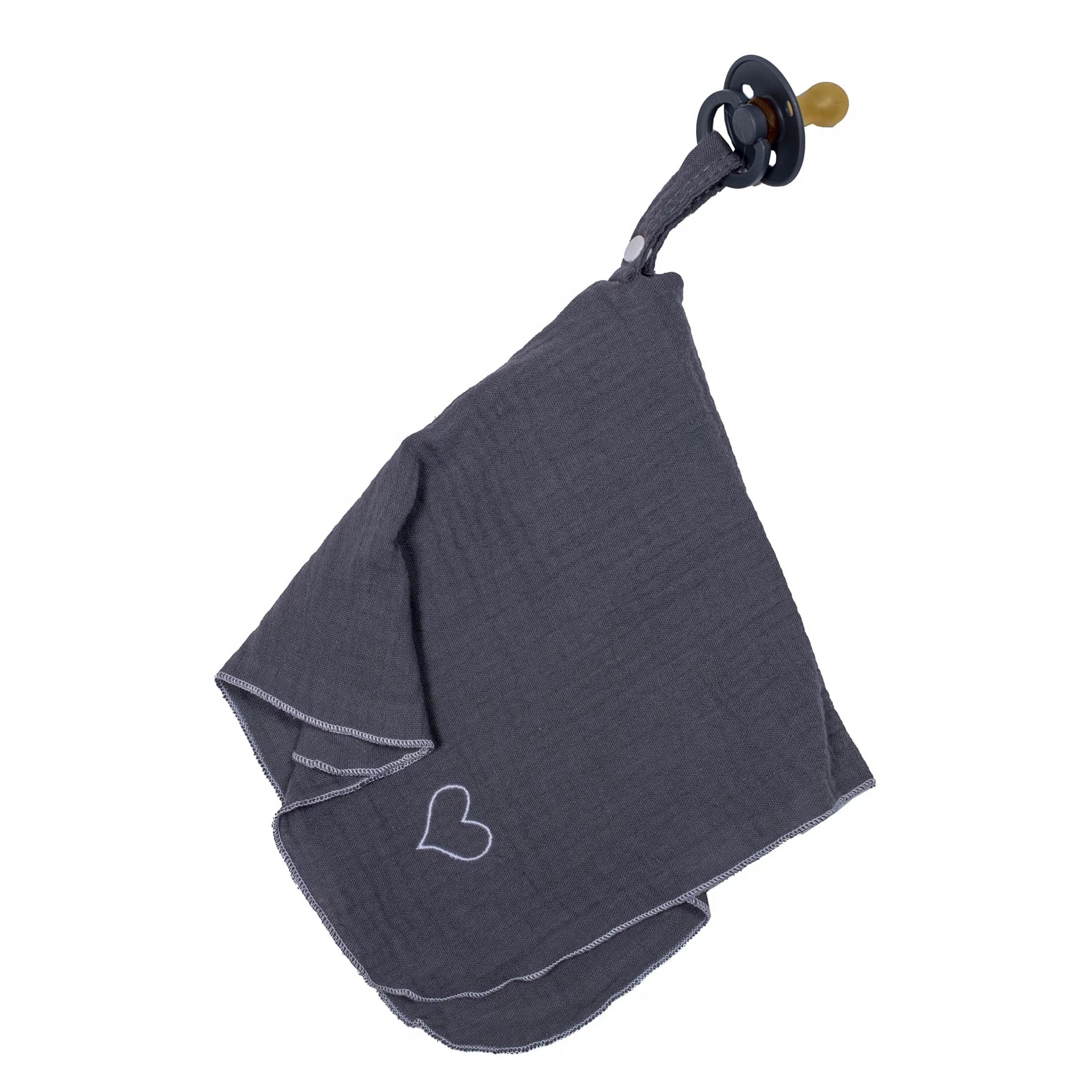 • Manta cinzenta com borda branca e coração bordado presa a chupeta