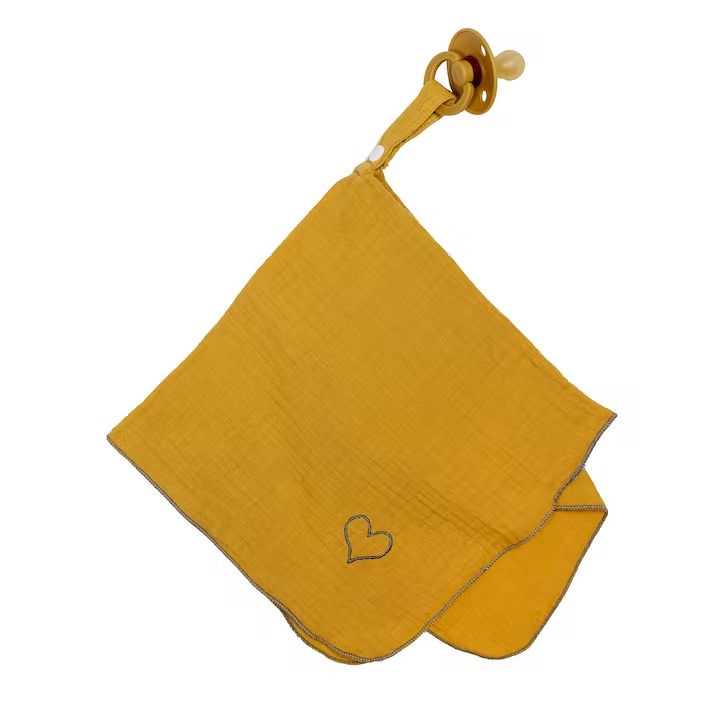 • Chupeta bege com pano amarelo e borda cinzenta com coração bordado