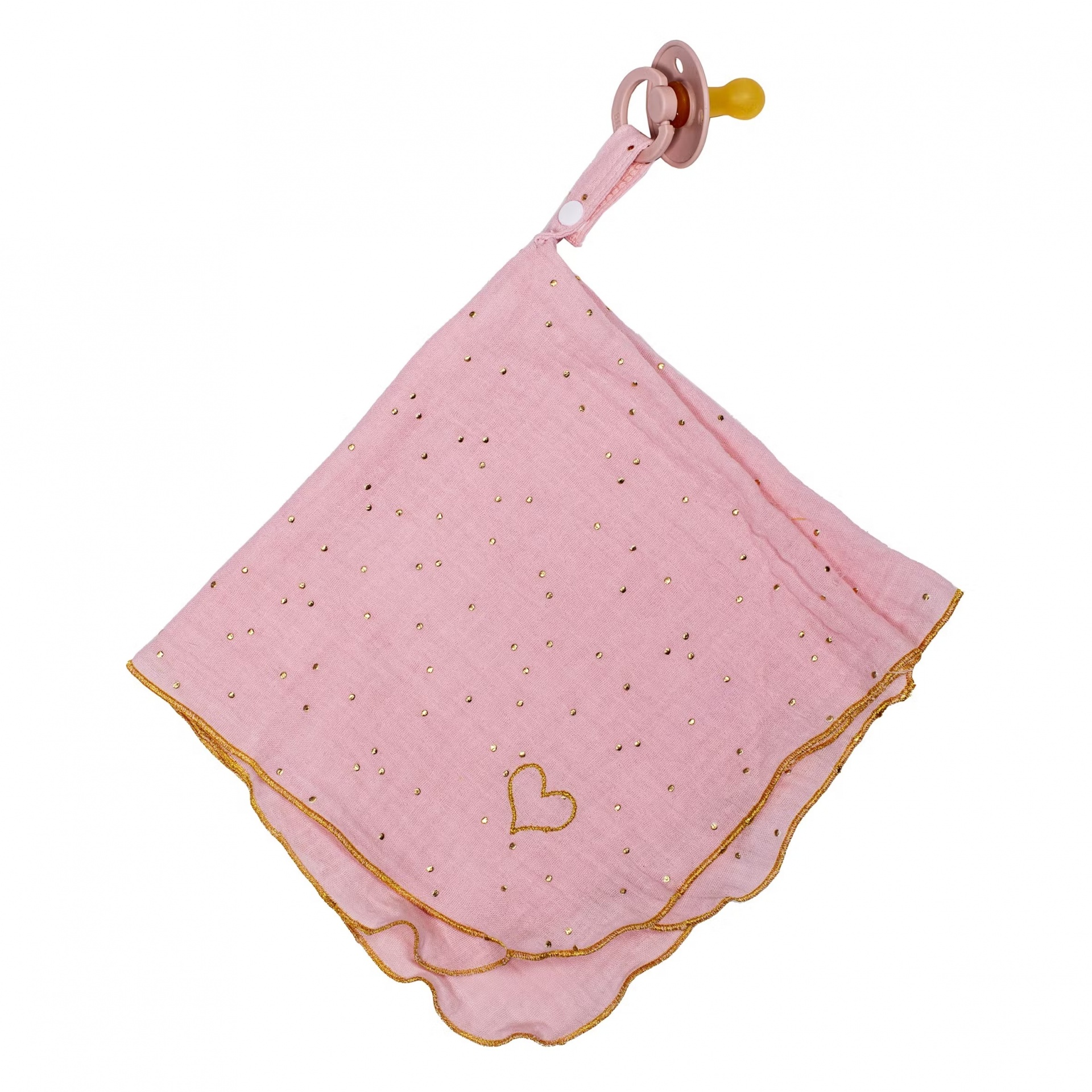 • Lenço rosa com pontos dourados, borda ondulada e chupeta rosa