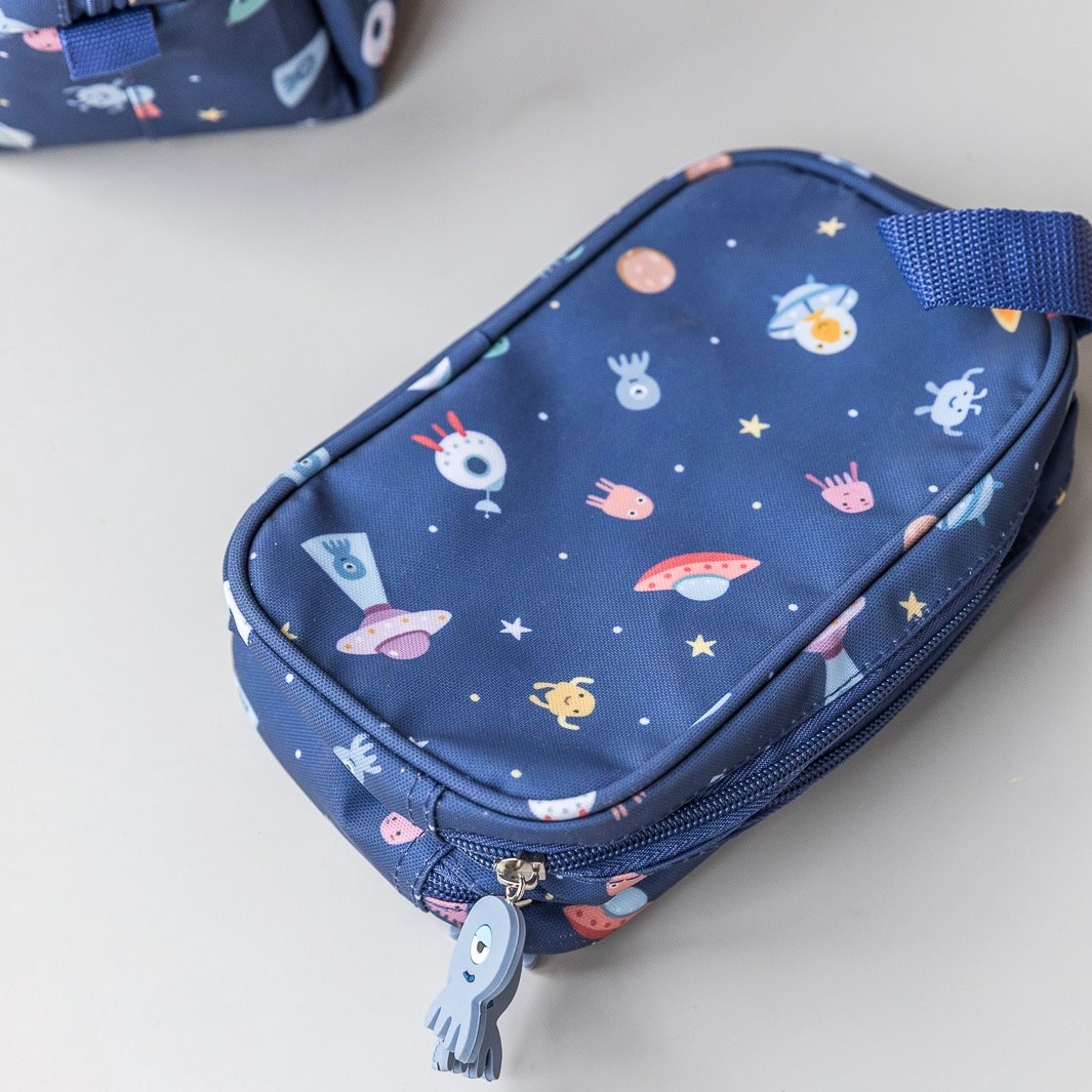 • Estojo azul escuro com padrão espacial e puxador em forma de alienígena