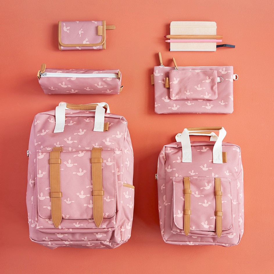 • Mochilas e acessórios rosas com padrão branco e detalhes castanhos