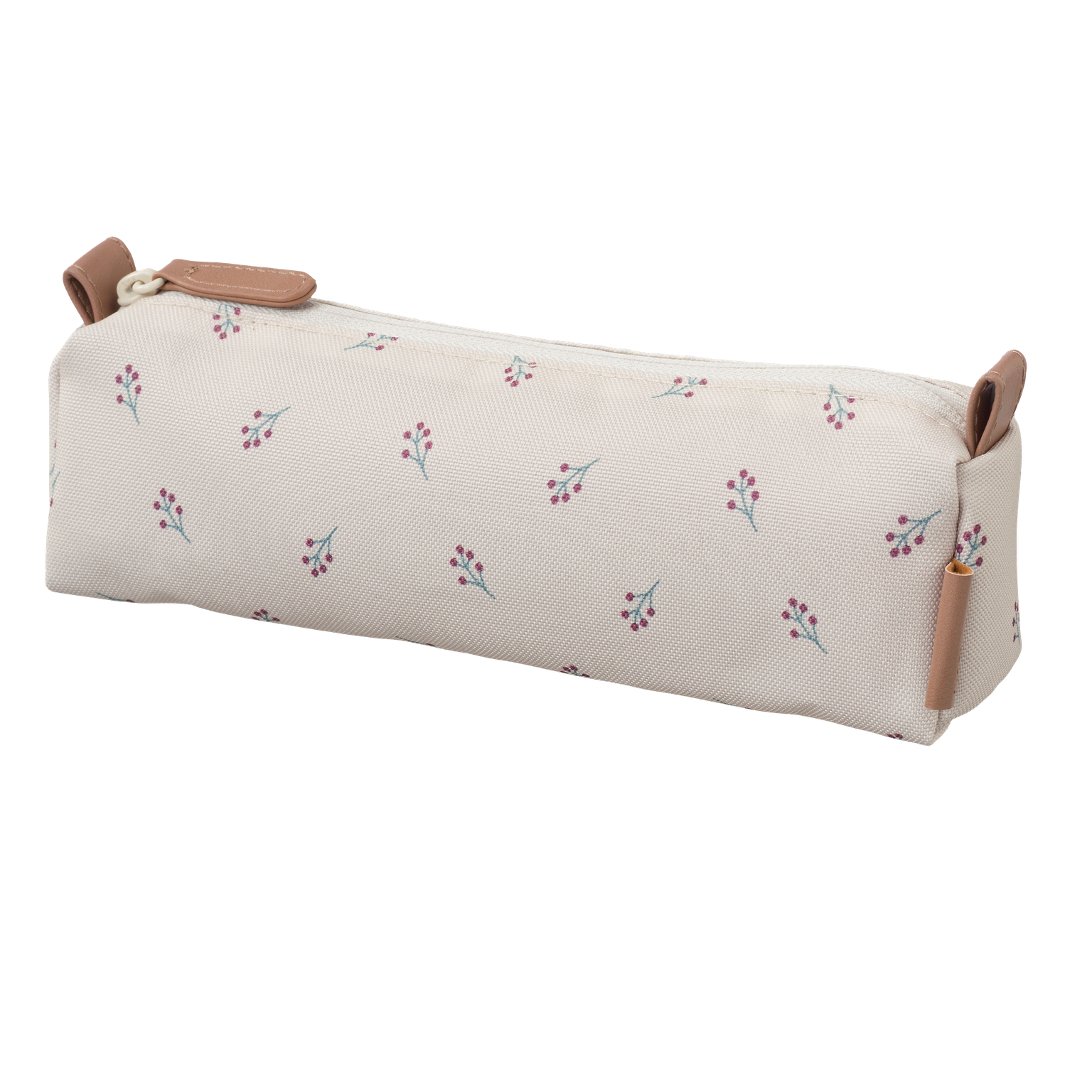 • Estojo branco com padrões florais e fecho zip bege