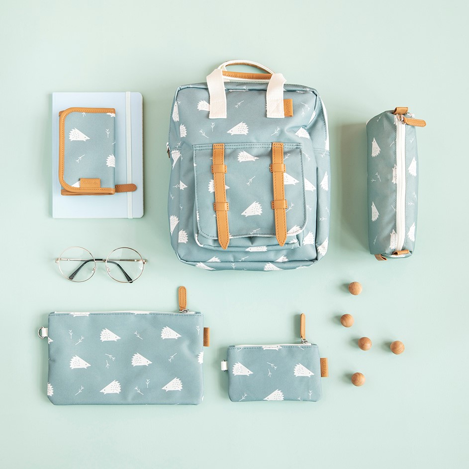 • Conjunto azul-petróleo com padrão branco e detalhes castanhos incluindo mochila, carteira, estojo, caderno e acessórios.