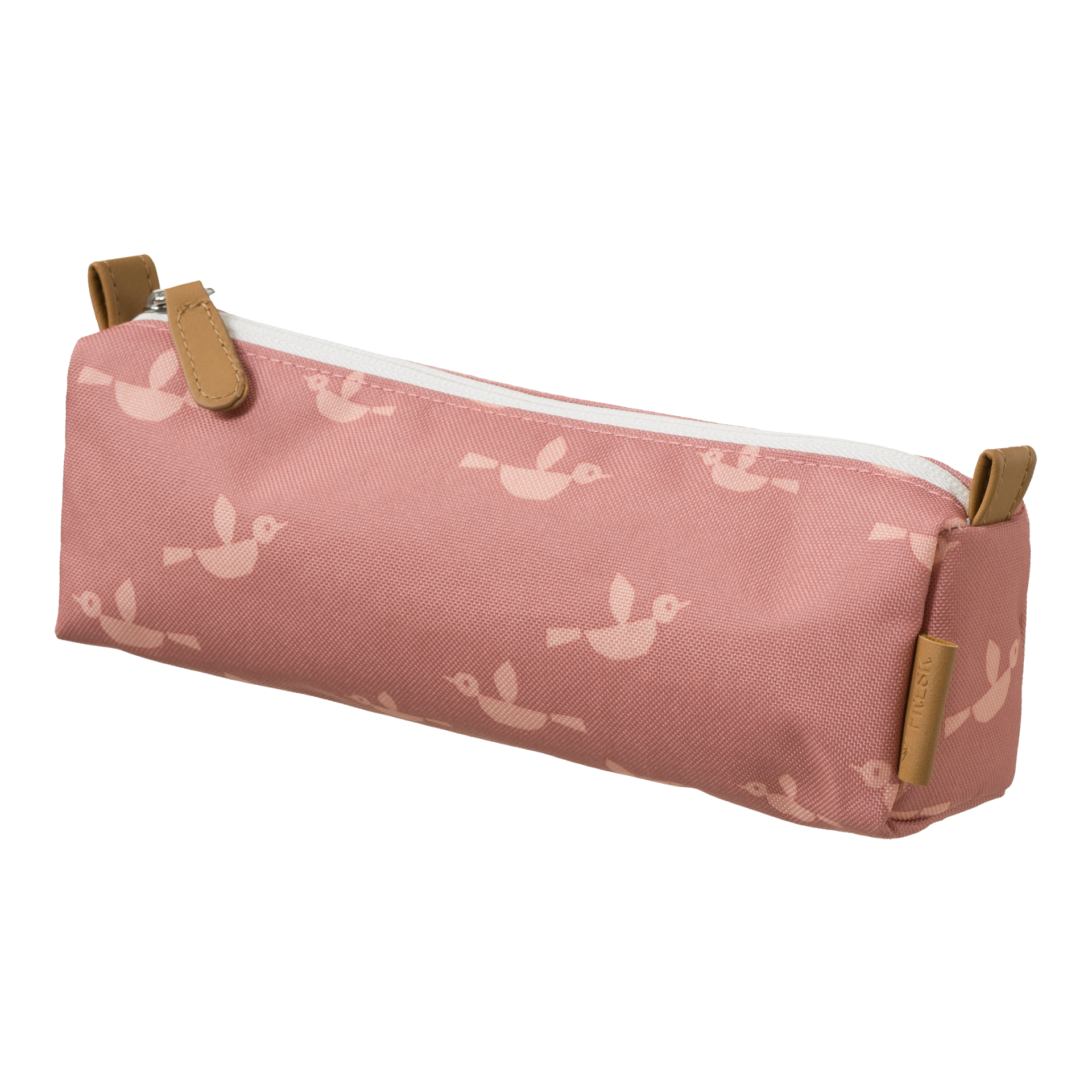 • Estojo cor-de-rosa com padrão de pássaros brancos e fecho branco
