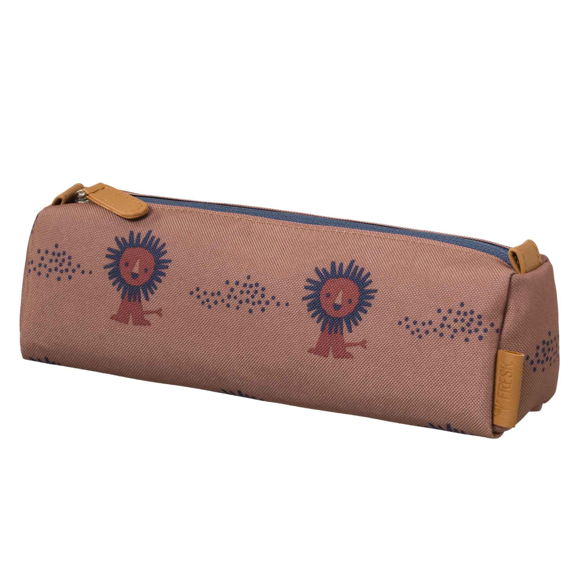 • Estojo castanho com padrão de leões e fecho azul