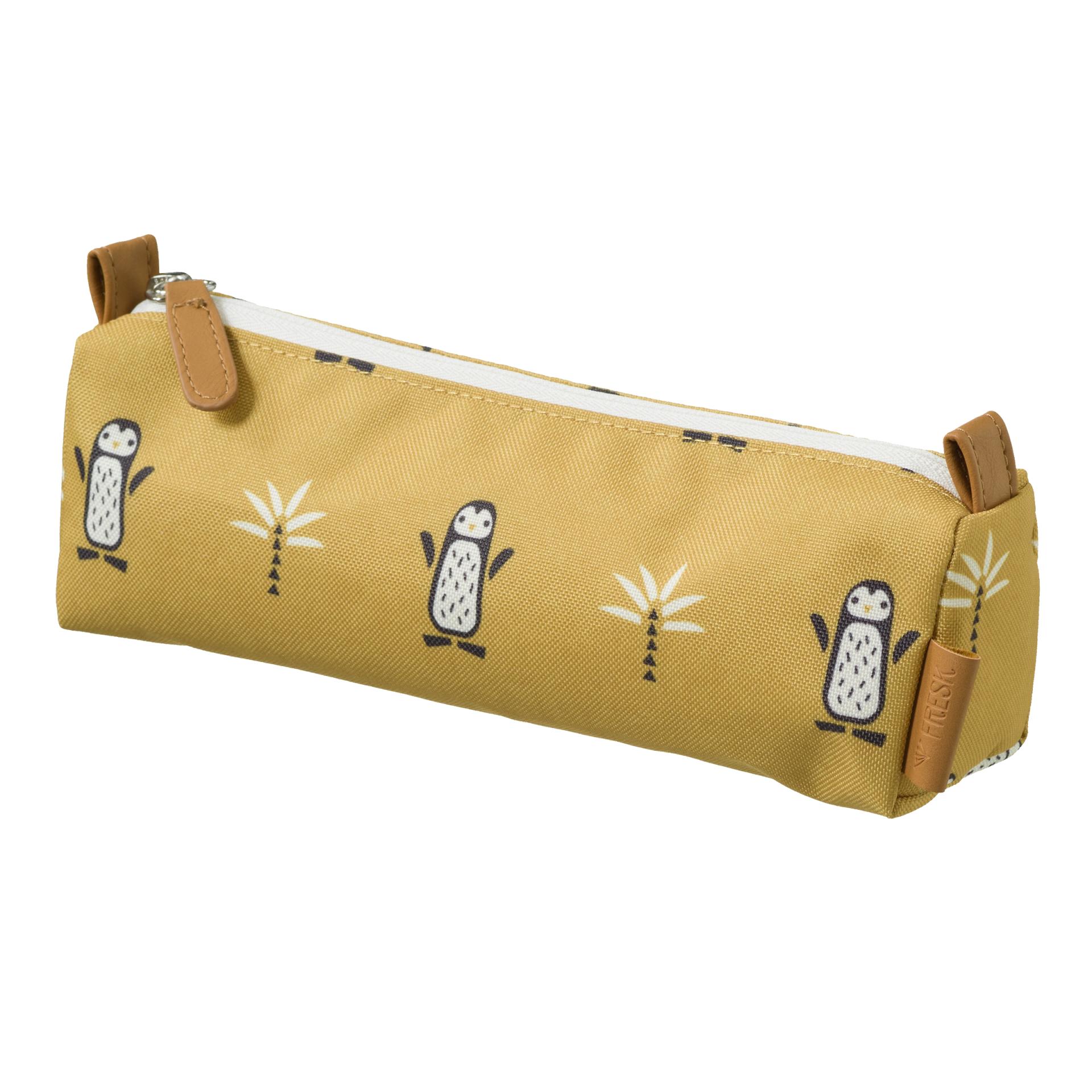 • Estojo escolar amarelo com padrão de pinguins e fecho branco