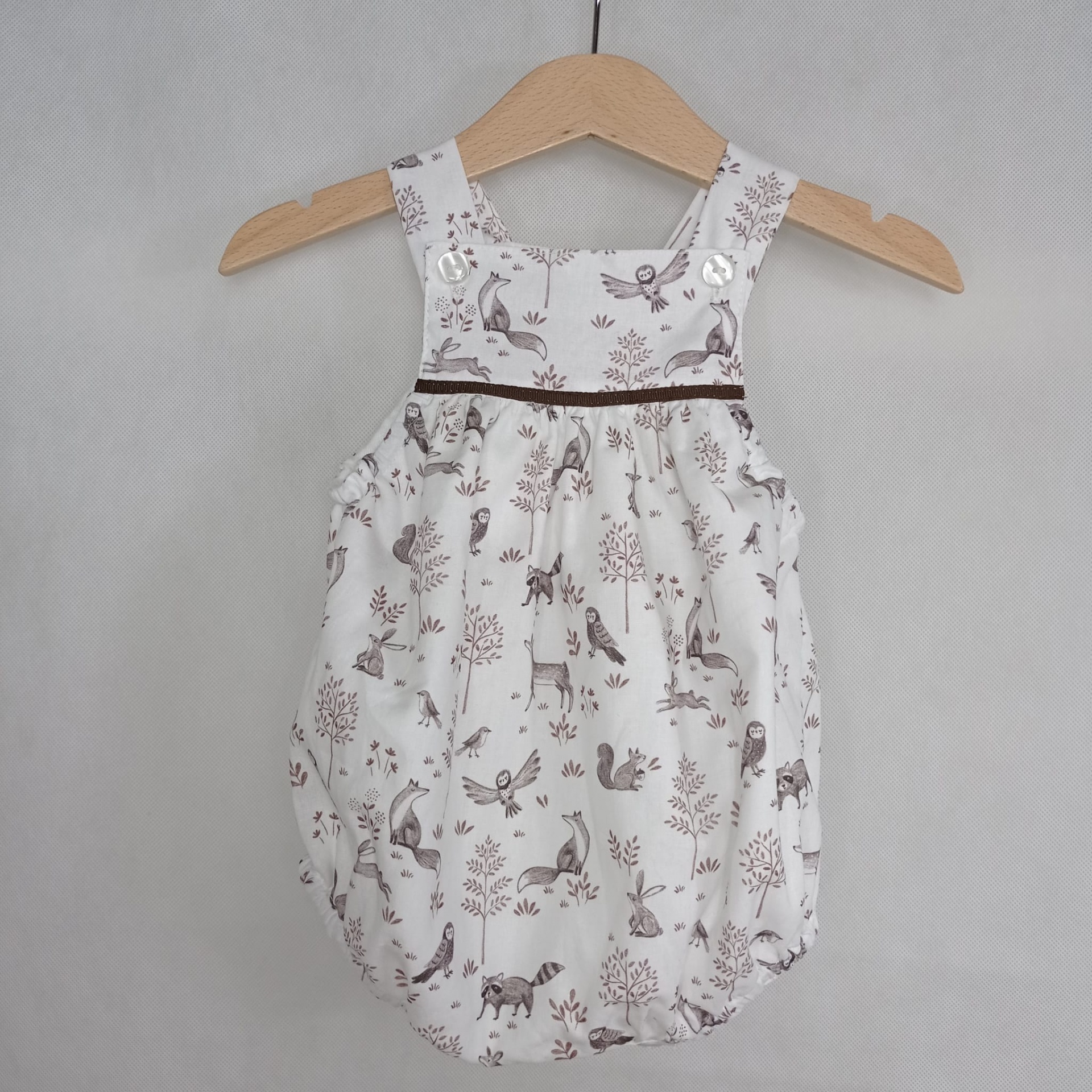 • Macacão de bebé branco com padrão de animais castanhos em cabide de madeira