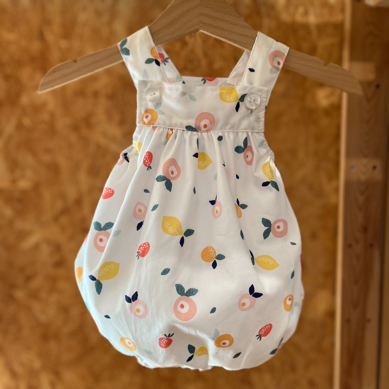 • Macacão curto de bebé com padrão de frutas coloridas pendurado num cabide de madeira
