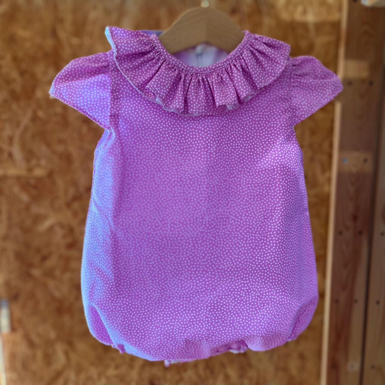 Macacão de bebé rosa com gola folhada e padrão de pontos brancos pendurado em cabide de madeira