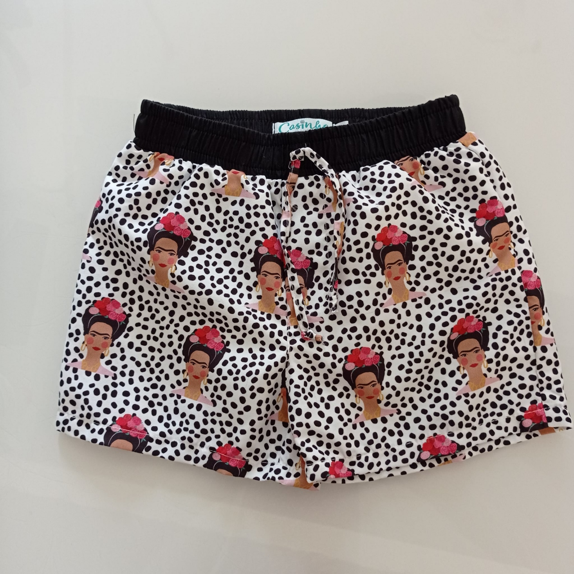 • Calções brancos com padrão de manchas pretas e estampas femininas coloridas, cintura preta elástica com cordão.
