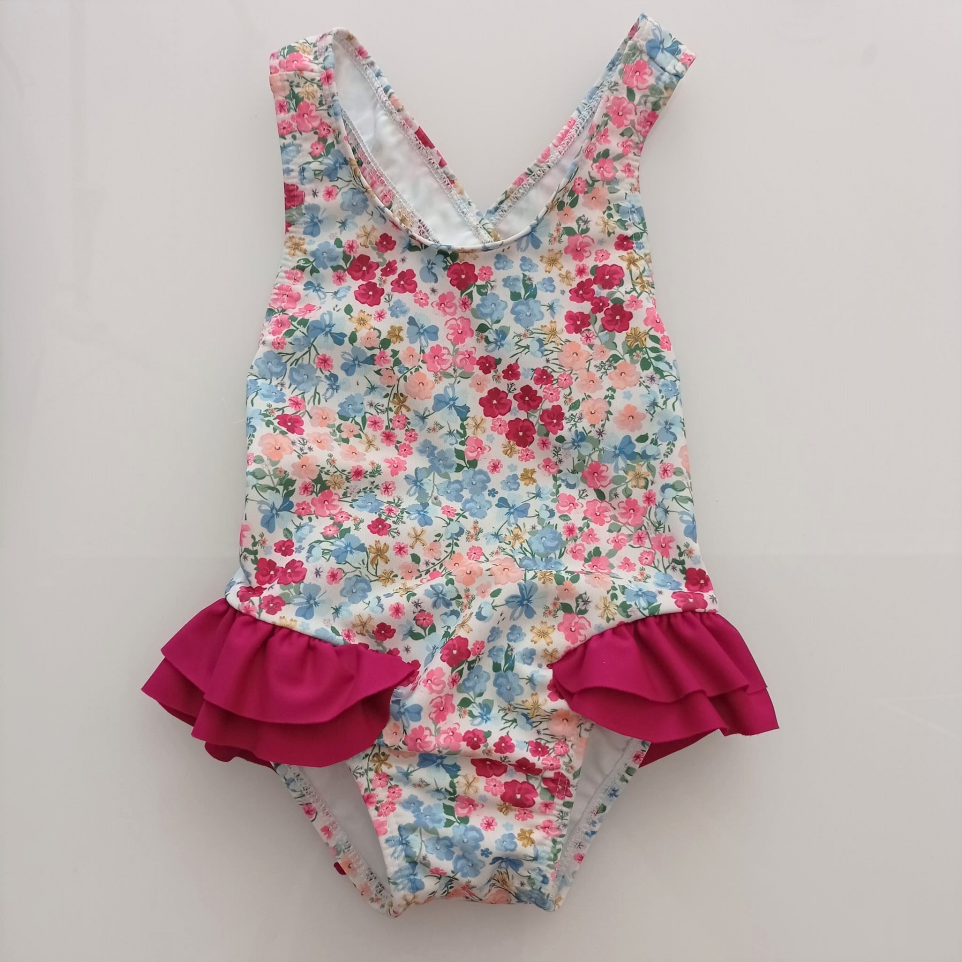 • Fato de banho infantil floral com folhos cor de vinho