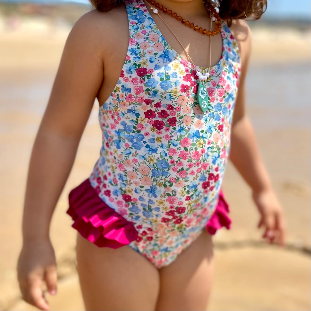 • Fato de banho infantil floral com folhos cor de vinho e colares numa praia.