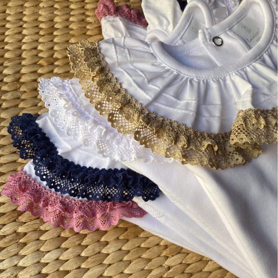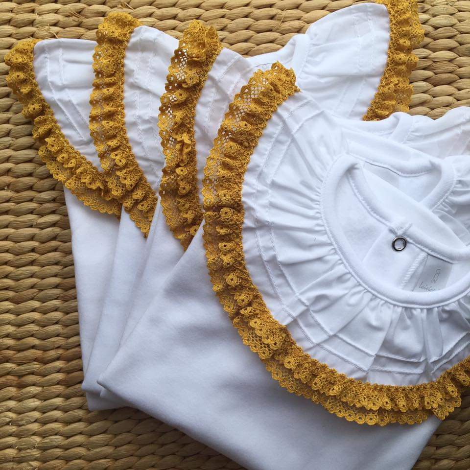 • Bodies de bebê brancos com gola de renda colorida sobre tapete de fibras naturais