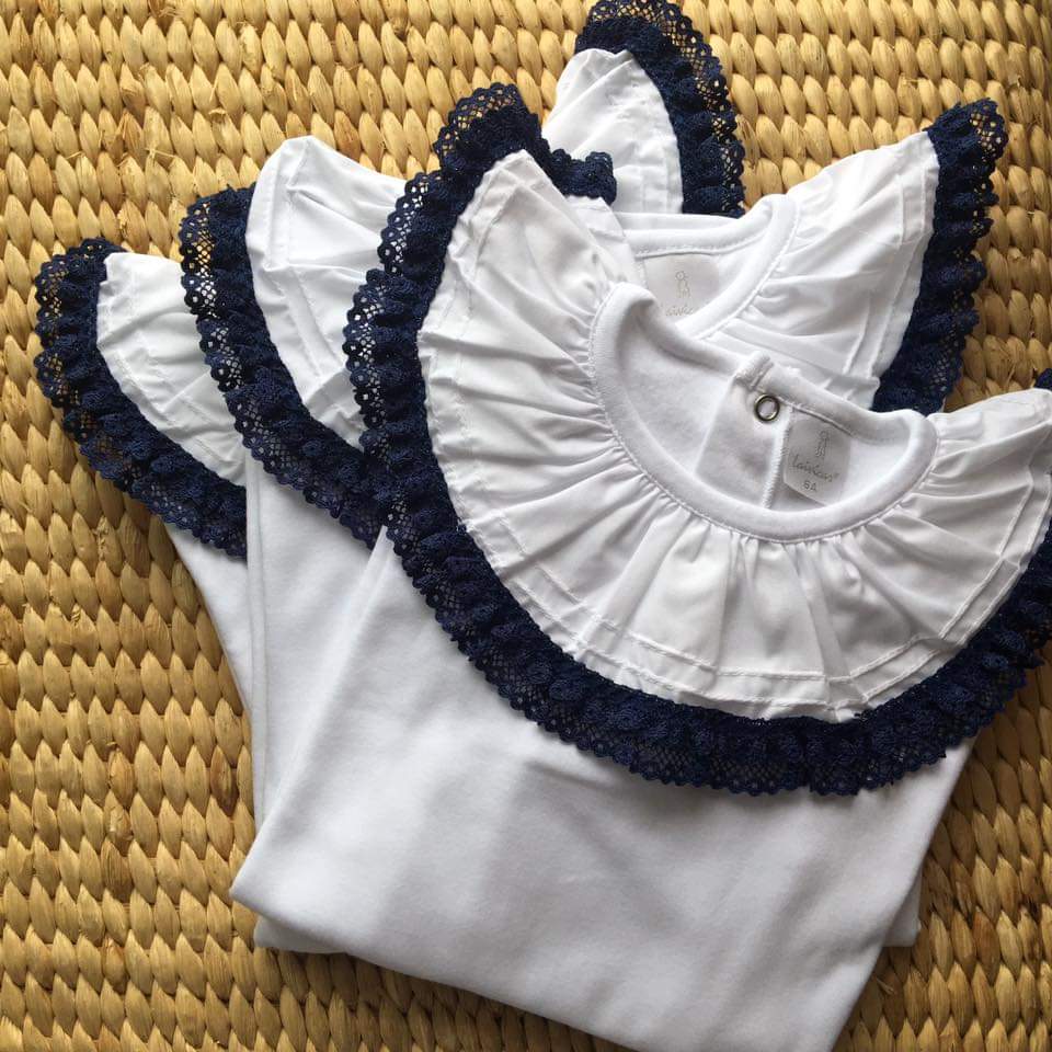 • Três blusas brancas com gola azul escura sobre superfície de fibra natural entrelaçada
